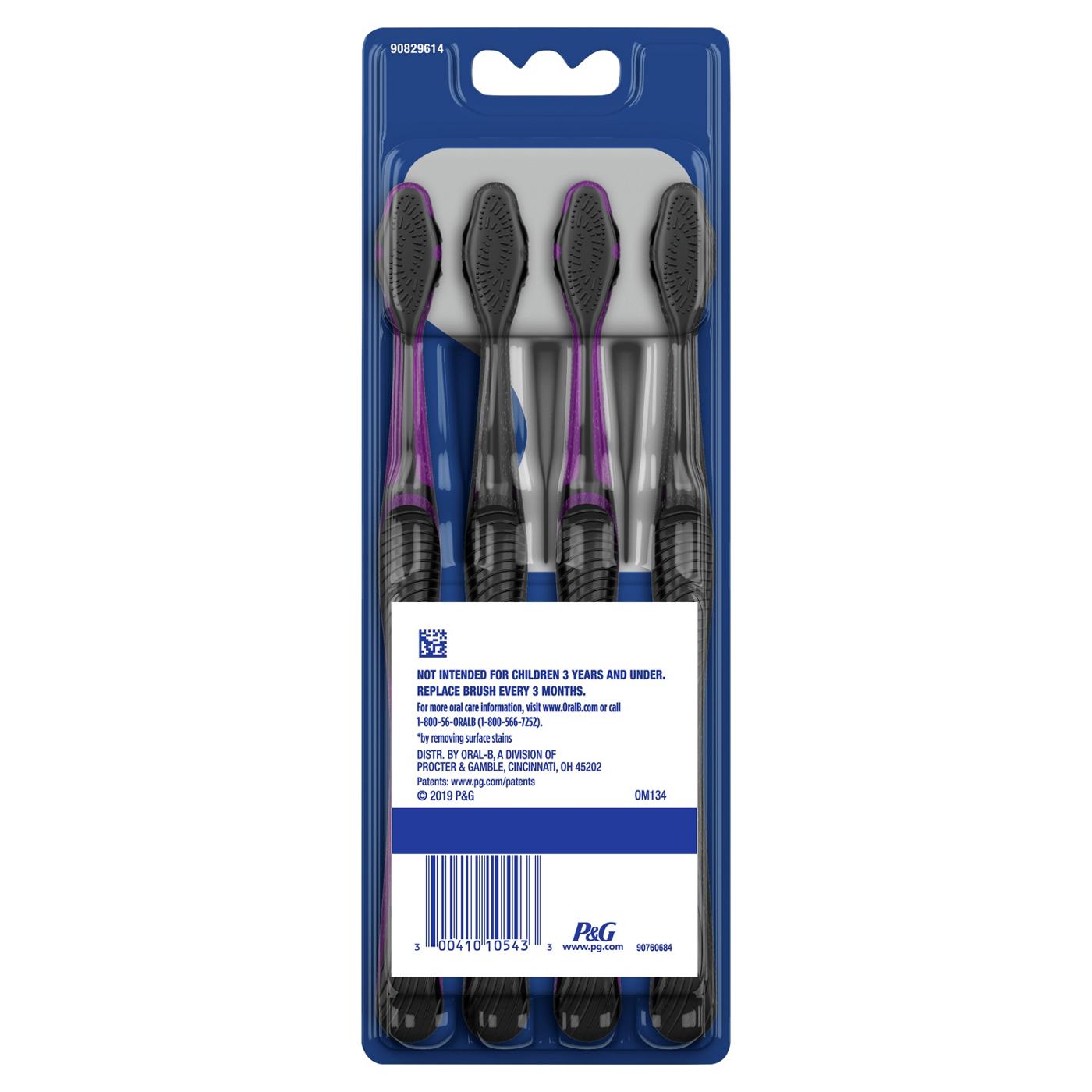The Oral-B Charcoal toothbrush features charcoal infused bristles! It whitens teeth by removing surface stains. PowerTip bristles help clean plaque in hard to reach places while Gum Massagers gently massage your gums and help clean along the gumline. Additionally, the Tongue and Cheek Cleaner work to gently clean your tongue and cheeks. Whitens teeth by removing surface stains. Dentists recommend changing your brush every 3 months. A new toothbrush can remove up to 30% more plaque than one 3 months old (research with a flat trim manual toothbrush). Trust the brand more dentists use themselves worldwide, Oral-B.