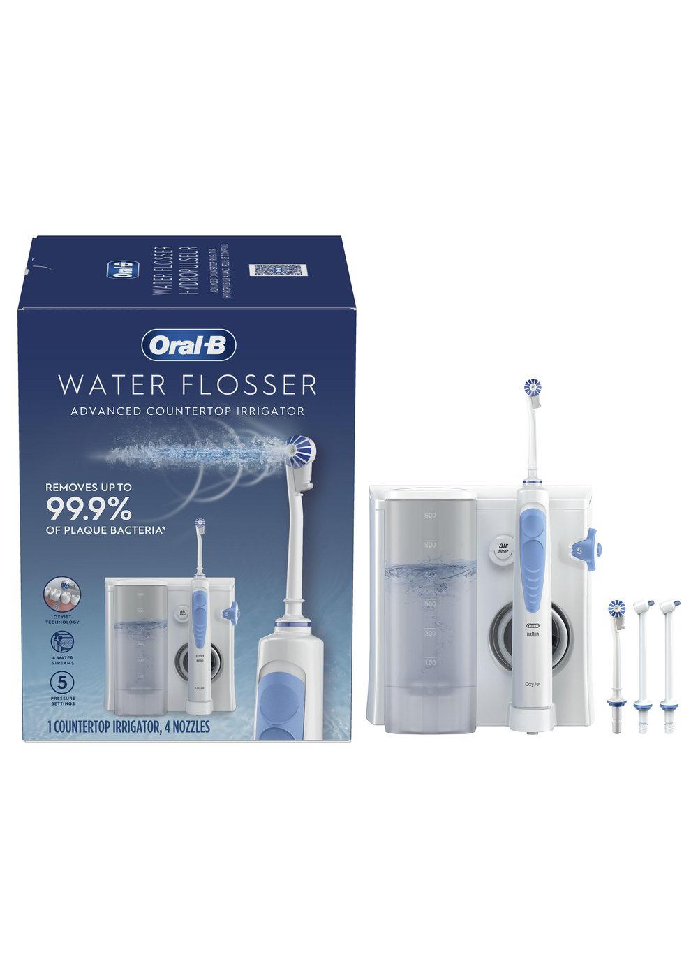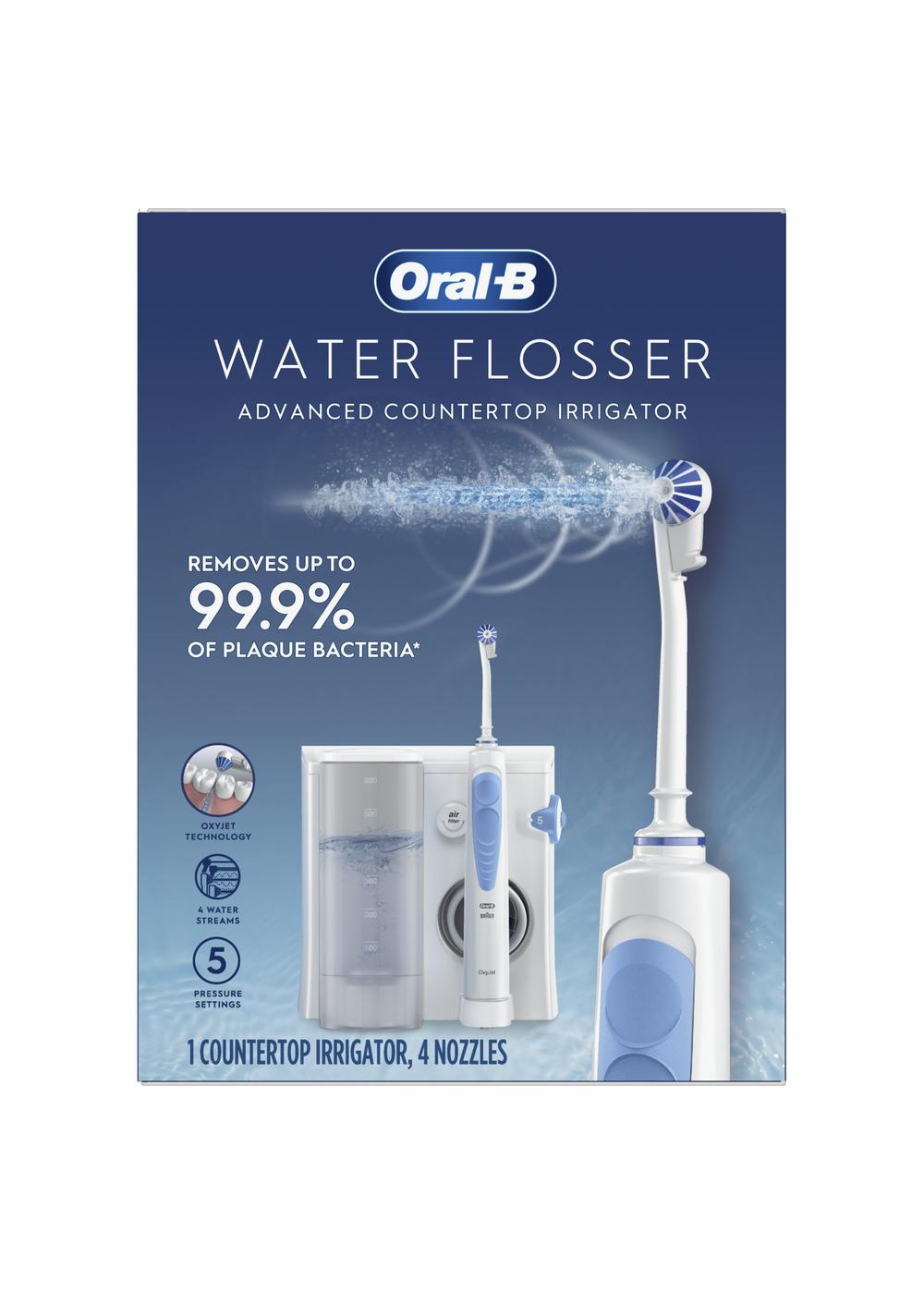 Oral-B Water Flosser deep cleans and detoxifies below the gumline (helps reduce plaque bacteria and inflammatory components associated with gingivitis, when used as an adjunct to brushing, flossing and regular professional care). Its unique Oxyjet Technology uses water enriched with microbubbles of air to help eliminate plaque bacteria for healthier gums. The on-demand button gives you great control with less mess. Personalized streams allow for customized cleaning: Multi-Jet for all-around clean, Focused for targeted cleaning, Rotational for gum massage.