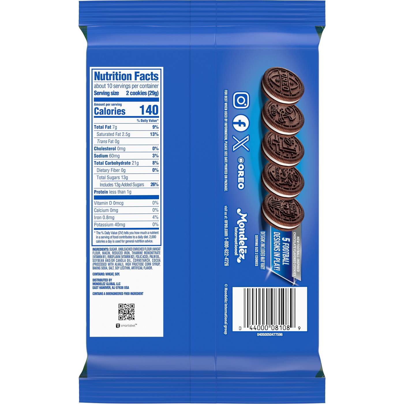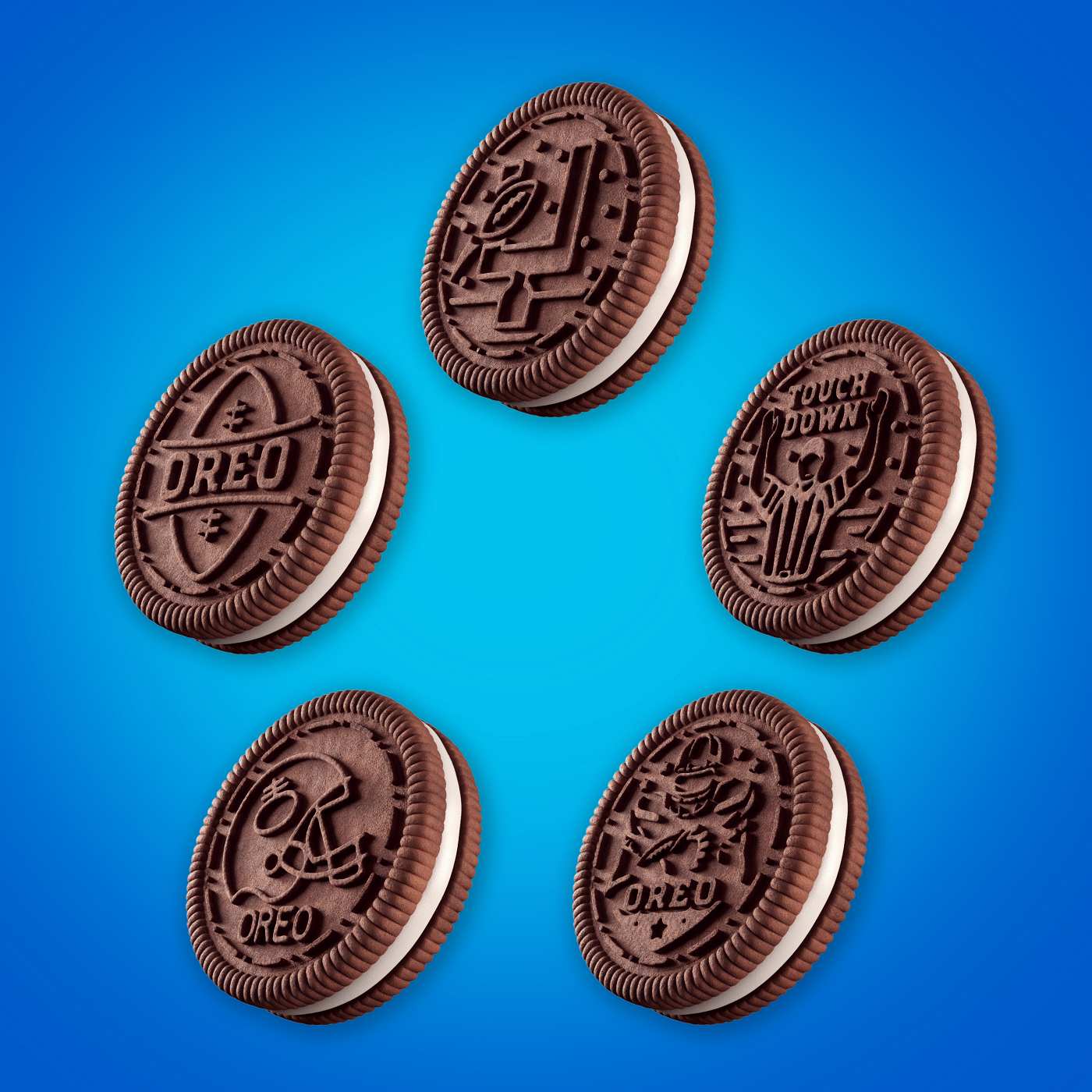 Make the big game even more enjoyable with OREO Game Day Chocolate Sandwich Cookies. These limited edition football-inspired chocolate-flavored cookies sandwich original OREO creme between two chocolate wafers for supremely dunkable, sweet snacks. Milk's favorite cookie takes on a fun, sporty twist with five unique football-inspired embossed designs, including a football, a helmet, a ball soaring through the goalpost, a football player, and a referee signalling a touchdown (designs included may vary). These certified kosher OREO cookies make great game day party snacks and tailgating party food.
