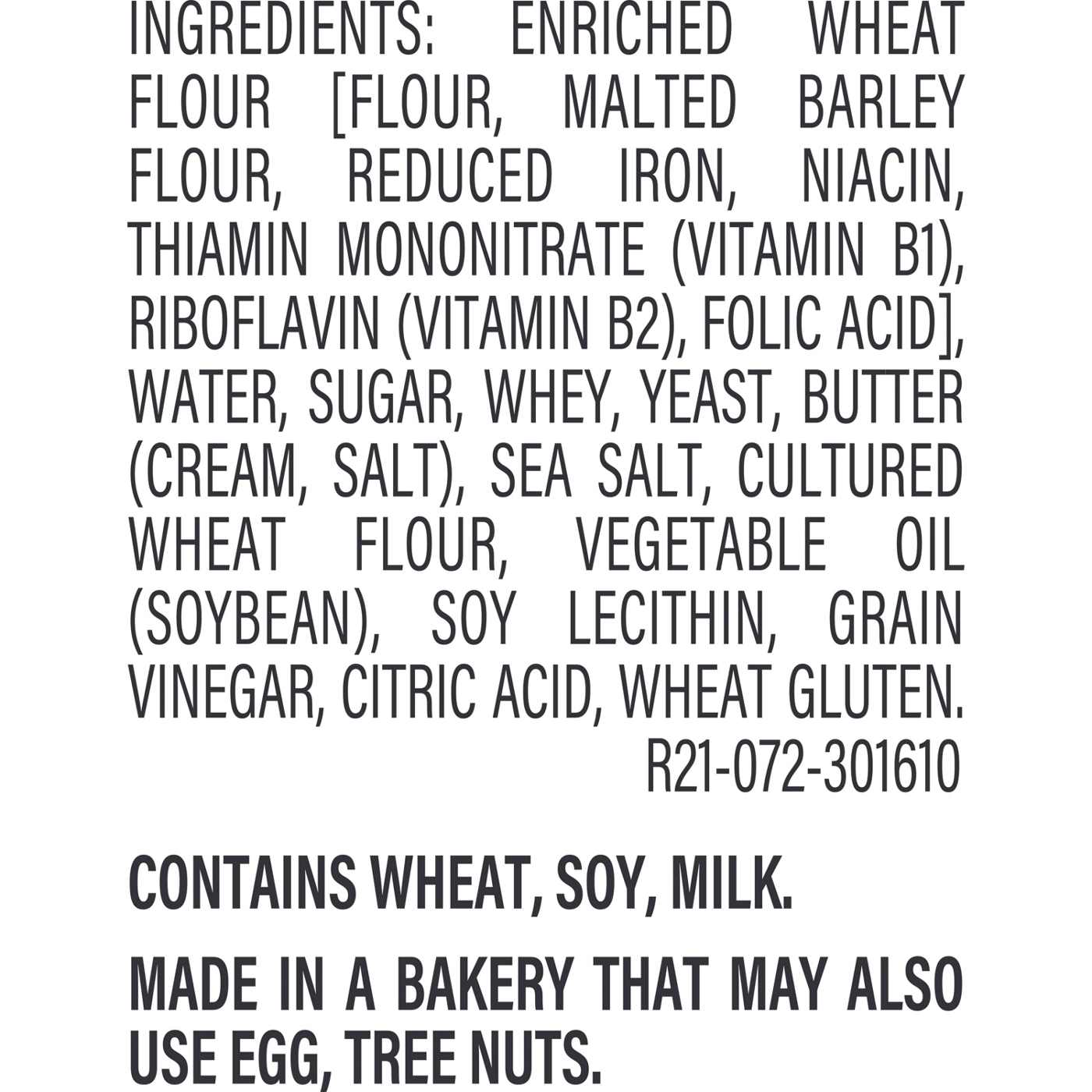 Enriched Wheat Flour [Flour, Malted Barley Flour, Reduced Iron, Niacin, Thiamin Mononitrate (Vitamin B1), Riboflavin (Vitamin B2), Folic Acid], Water, Sugar, Yeast, Vegetable Oil (Soybean), Sea Salt, Natural Flavor, Fermented Wheat Flour, Wheat Gluten, Soy, Soy Lecithin, Citric Acid, Whey.