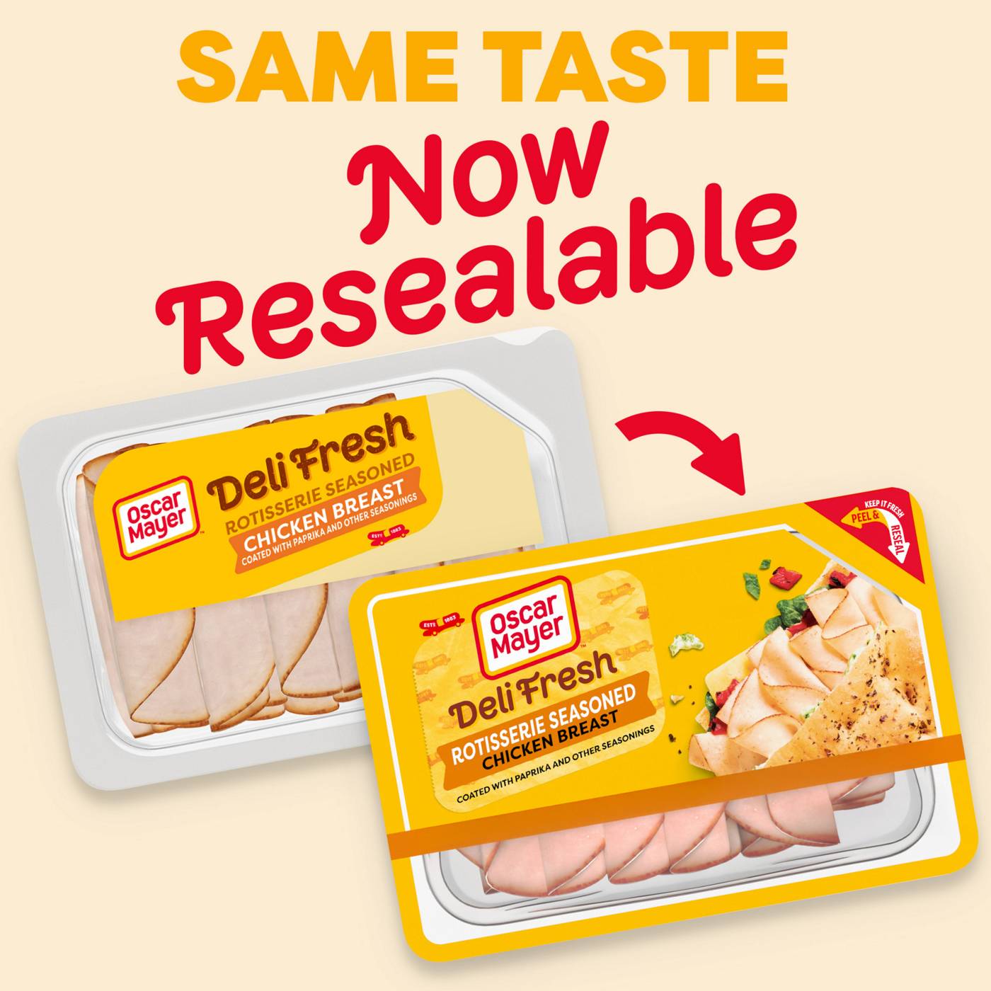 Skip the deli line and enjoy the sliced chicken breast you know, love and trust. Oscar Mayer Deli Fresh Rotisserie Seasoned Chicken Breast delivers the flavorful slices you crave, coated with paprika and other seasonings. Chicken breast slices are fully cooked and ready to enjoy. Made with no artificial preservatives and no nitrites or nitrates added, each serving of rotisserie seasoned chicken breast slices contains 8 grams of protein (see ingredient line for ingredients to support quality). Our Peel and Reseal feature ensures maximum freshness, thanks to our fully resealable lid that keeps every slice as delicious as the first. Whether you're stacking a sandwich, adding protein to your salad, crafting a charcuterie board or snacking straight from the fridge, you can count on the resealable packaging to lock in freshness after every use. Each 9-ounce pack of sliced chicken breast contains 4. 5 servings. Keep it Oscar and enjoy deli-style chicken breast at home.• One 9 oz pack of Oscar Mayer Deli Fresh Rotisserie Seasoned Chicken Breast Coated with Paprika and Other Seasonings• Meat used is 100% chicken breast, coated with paprika and other seasonings• Peel & Reseal packaging our fully resealable lid ensures maximum freshness• Our chicken breast deli meat slices are gluten-free• Rotisserie seasoned chicken breast slices are ideal for sandwiches, wraps, salads, charcuterie boards, snacking straight from the pack and more• No artificial preservatives and no nitrites or nitrates added, see ingredient line for ingredients to support quality• 8g protein per serving• Contains 4.5 servings of fully cooked, ready-to-eat chicken breast slices per container• Once opened, use within 7 days; keep refrigerated• Keep it Oscar with our wide range of cold cuts, bacon, hot dogs and meat snack plates