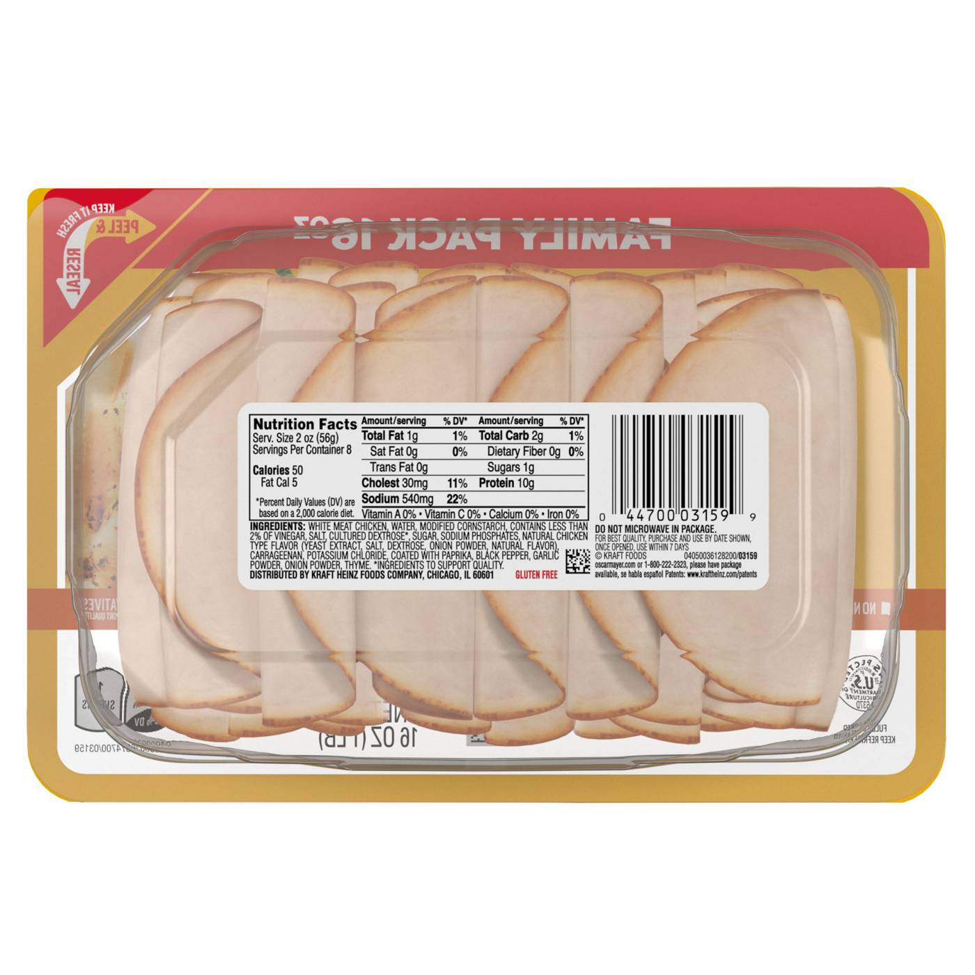 Make a delicious deli sandwich at home with Oscar Mayer Deli Fresh Rotisserie Seasoned Chicken Breast, Coated With Paprika And Other Seasonings, Sliced Lunch Meat. Our quality chicken deli meat is 98% fat-free and made with no artificial preservatives, see back panel for ingredients to support quality, no added hormones*, and no added nitrates or nitrites. *Federal regulations prohibit the use of hormones in poultry. Fully cooked and ready to eat, our chicken slices are coated with paprika and other seasonings, making them perfect for a sandwich, salad, or cheese and crackers. Keep our family sized 16-ounce package of deli chicken refrigerated to maintain freshness. If you enjoy our rotisserie chicken lunch meat, try our honey ham or turkey as well as many other varieties of deli department cold cuts.• One 16 oz family size plastic tray of Oscar Mayer Deli Fresh Rotisserie Seasoned Chicken Breast, Coated With Paprika And Other Seasonings, Sliced Lunch Meat• Oscar Mayer Deli Fresh Rotisserie Seasoned Chicken Breast, Coated With Paprika And Other Seasonings ,Sliced Lunch Meat is made from chicken raised with no added hormones. Federal regulations prohibit the use of hormones in poultry.• Sliced rotisserie seasoned chicken breast Coated With Paprika And Other Seasonings is 98% fat-free• Rotisserie chicken breast lunch meat has no artificial preservatives, see back panel for ingredients to support quality and no added nitrates or nitrites• Our sliced chicken breast is coated with paprika and other seasonings• Rotisserie seasoned chicken breast, Coated With Paprika And Other Seasonings slices, are fully cooked and ready to eat• Add a few slices of oven roasted chicken lunch meat to sandwiches, wraps, deli platters, salads, or cheese and crackers• So many ways to keep it Oscar with our wide range of cold cuts, bacons, hot dogs and meat snack plates• SNAP & EBT eligible food item
