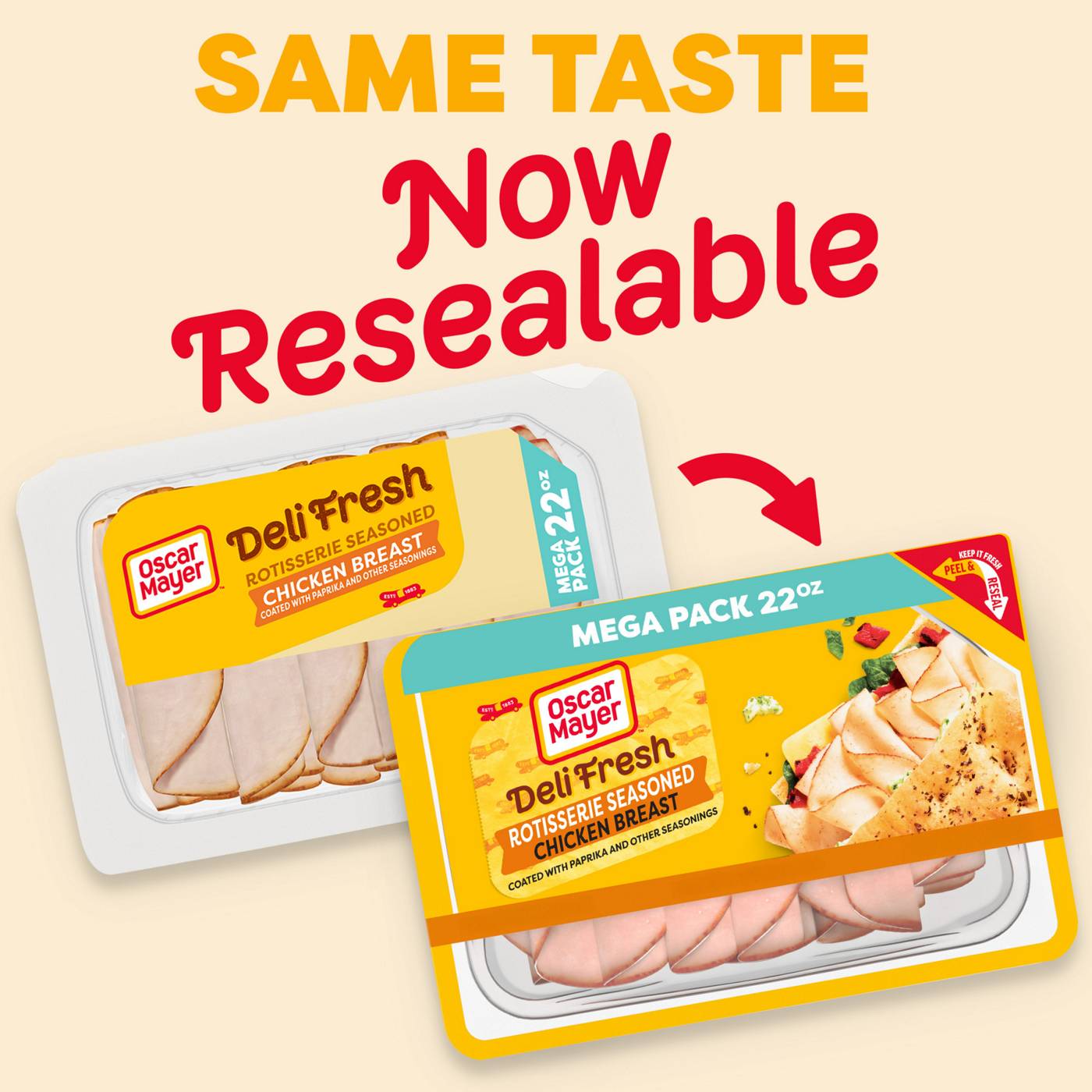 Skip the deli line and enjoy the sliced chicken breast you know, love and trust. Oscar Mayer Deli Fresh Rotisserie Seasoned Chicken Breast delivers the flavorful slices you crave, coated with paprika and other seasonings. Chicken breast slices are fully cooked and ready to enjoy. Made with no artificial preservatives and no nitrites or nitrates added, each serving of rotisserie seasoned chicken breast slices contains 8 grams of protein. Our Peel and Reseal feature ensures maximum freshness, thanks to our fully resealable lid that keeps every slice as delicious as the first. Whether you're stacking a sandwich, adding protein to your salad, crafting a charcuterie board or snacking straight from the fridge, you can count on the resealable packaging to lock in freshness after every use. Each 22-ounce mega pack of sliced chicken breast contains 11 servings. Keep it Oscar and enjoy deli-style chicken breast at home.• 22 OZ PACK: One 22 oz mega pack of Oscar Mayer Deli Fresh Rotisserie Seasoned Chicken Breast• OSCAR MAYER CHICKEN: Made with 100% chicken breast, coated with paprika and other seasonings• STAYS BETTER LONGER: Peel & Reseal packaging our fully resealable lid ensures maximum freshness• ENDLESS WAYS TO ENJOY: Rotisserie seasoned chicken breast slices are ideal for sandwiches, wraps, salads, charcuterie boards, snacking straight from the pack and more• JUST THE FACTS: No artificial preservatives and no nitrites or nitrates added• 8G PROTEIN: 8g protein per serving• READY TO EAT: Contains 11 servings of fully cooked, ready-to-eat chicken breast slices per container• GLUTEN FREE: Our chicken breast deli meat slices are gluten-free• KEEP REFRIGERATED: Once opened, use within 7 days; keep refrigerated• TRUSTED SINCE 1883: Keep it Oscar with our wide range of cold cuts, bacon, hot dogs and meat snack plates