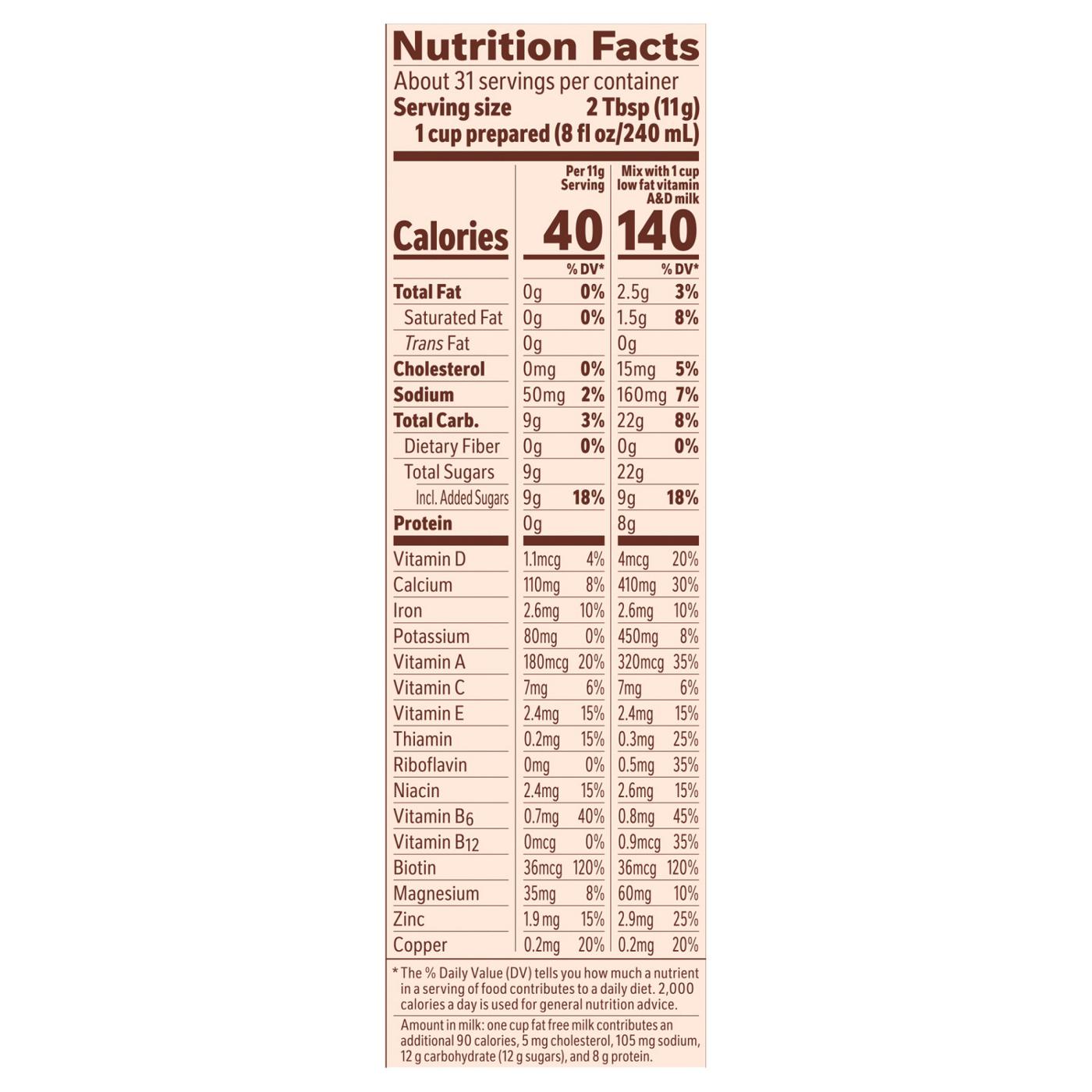 SUGAR, MALT EXTRACT (MALTED BARLEY, BARLEY, CARAMEL COLOR, SOY LECITHIN), COCOA PROCESSED WITH ALKALI, WHEY, BEET JUICE COLOR, SALT, SOY LECITHIN, NATURAL FLAVOR, MOLASSES, CARAMEL COLOR. VITAMINS AND MINERALS: CALCIUM CARBONATE, MAGNESIUM HYDROXIDE, VITAMIN C (SODIUM ASCORBATE), FERRIC ORTHOPHOSPHATE (IRON), ZINC SULFATE, VITAMIN E ACETATE, NIACINAMIDE, COPPER GLUCONATE, VITAMIN A PALMITATE, VITAMIN B6 (PYRIDOXINE HYDROCHLORIDE), VITAMIN B1 (THIAMINE HYDROCHLORIDE), BIOTIN, VITAMIN D3.
