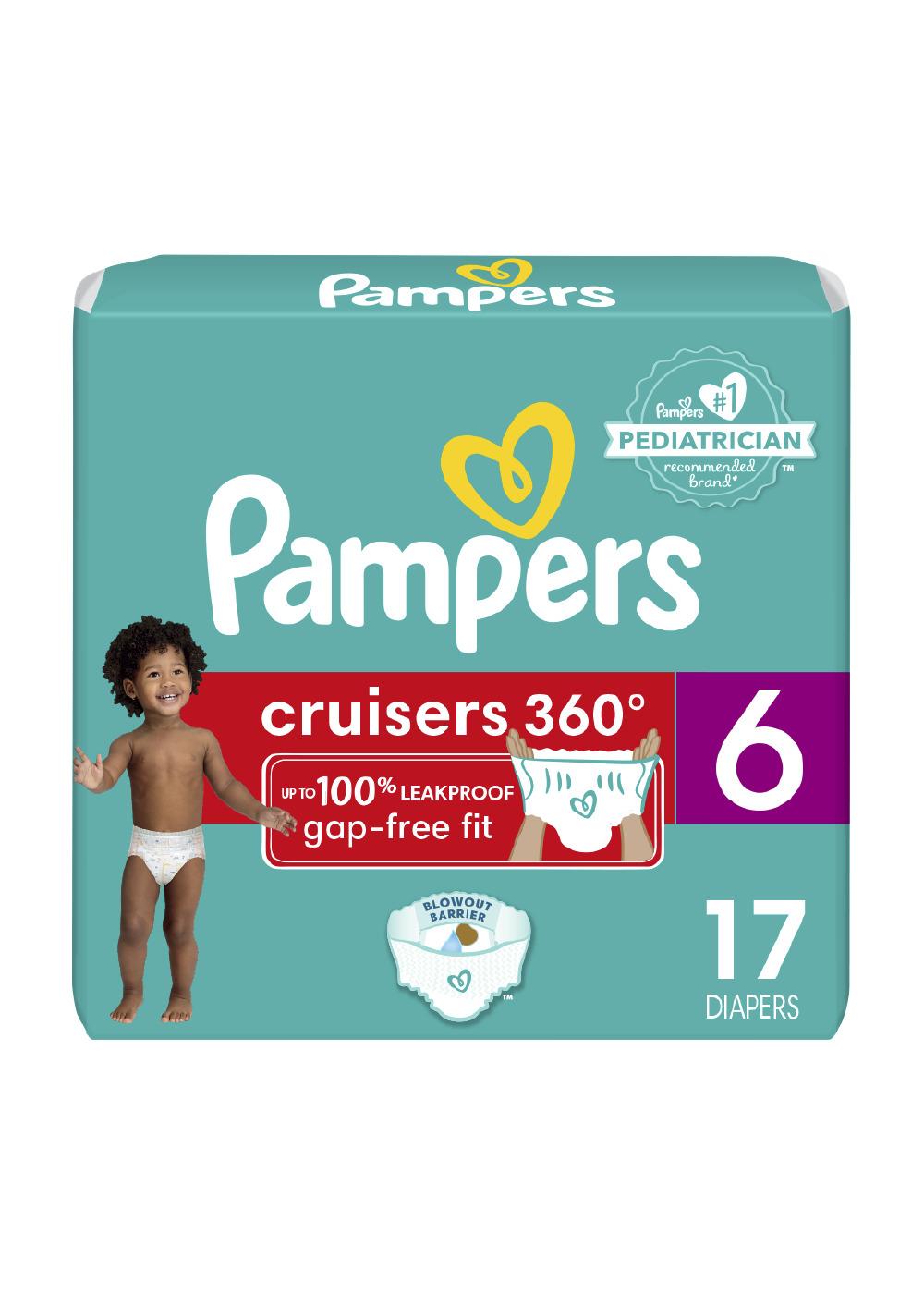 Pampers Cruisers 360 diapers are our best fit and protection for your active baby. Unlike ordinary disposable diapers that gap in the back, Pampers Cruisers 360 diapers stretch comfortably around your baby's waist and adapt to their every move for a flexible, gap-free fit that is up to 100% leakproof. Plus, they feature our Dual Leak-Guard Barriers that gently seal around your baby's legs, where leaks happen most. And forget fiddling with ordinary diaper tapes! Pampers Cruisers 360 has a 360-degree stretchy waistband designed to quickly and easily pull up onto your wiggly baby. And when a diaper change is complete, we've made disposal simple. All you need to do is RIP the Easy-Tear Sides and ROLL the diaper, then secure it with the disposal tape that comes attached to the back. Simple as that. Also, to keep your baby's delicate skin healthy, Pampers Cruisers 360 delivers breathable dryness, pulling out wetness and locking it away from skin using our exclusive LockAway Channels. Plus, Cruisers 360 is hypoallergenic-completely free of elemental chlorine bleaching, parabens and latex (natural rubber). For protection that will keep your little one happy and comfy on-the-go, trust Pampers, the #1 pediatrician recommended brand.