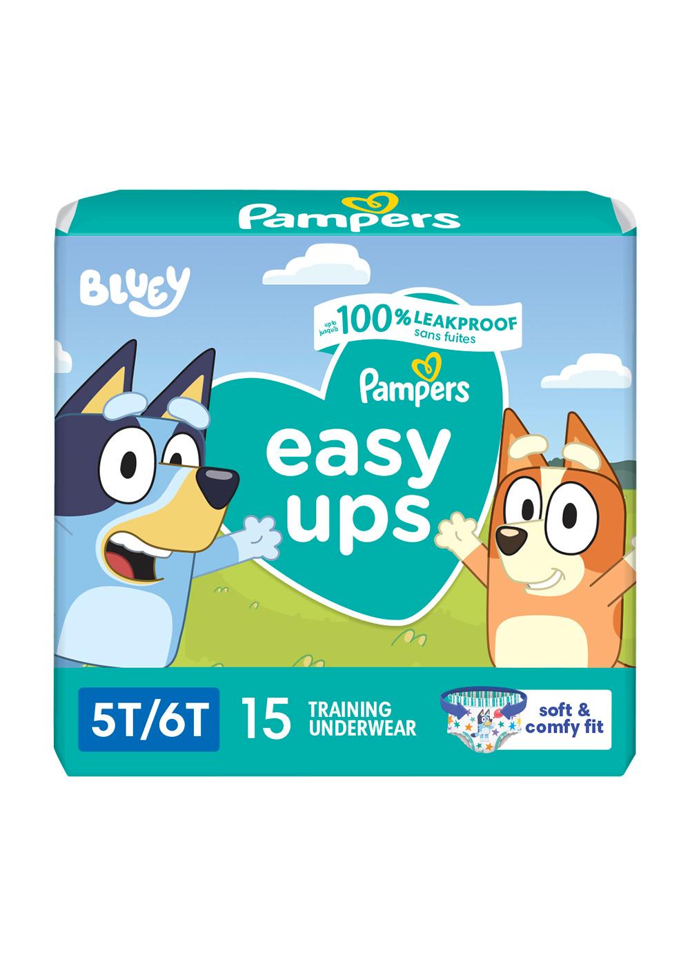 Ready to potty train with Bluey? Pampers Easy Ups Training Pants featuring Bluey makes it easy. They pair the feeling of real underwear with the protection of Pampers to make training easier for everyone. Give your child the confidence to take on potty training with a little more independence and a lot more fun. Easy Ups Training Pants feature stretchy sides and an underwear-like waistband for easy up and down, plus an ultra-absorbent core with LockAway Channel to help keep them dry day and night. With up to 2X better protection day and night*, Easy Ups deliver up to 100% leakproof protection. These hypoallergenic, dermatologist-approved training pants are made with 0% elemental chlorine, parabens, or latex** and backed by the Pampers Safety Promise. Fun Bluey designs motivate your toddler to potty train. Pampers Easy Ups are also available with Peppa Pig! Pair with Pampers Sensitive Wipes to help keep your toddler's skin healthy. Find your toddler's best fit in the following sizes: training pants 2T-3T (diaper size 4,15-34 lbs.), training pants 3T-4T (diaper size 5, 20-40 lbs.), training pants 4T-5T (diaper size 6, 23-50 lbs.), training pants 5T-6T (diaper size 7, 35-60 lbs.), training pants 6T-7T (diaper size 8, 46+ lbs.)
