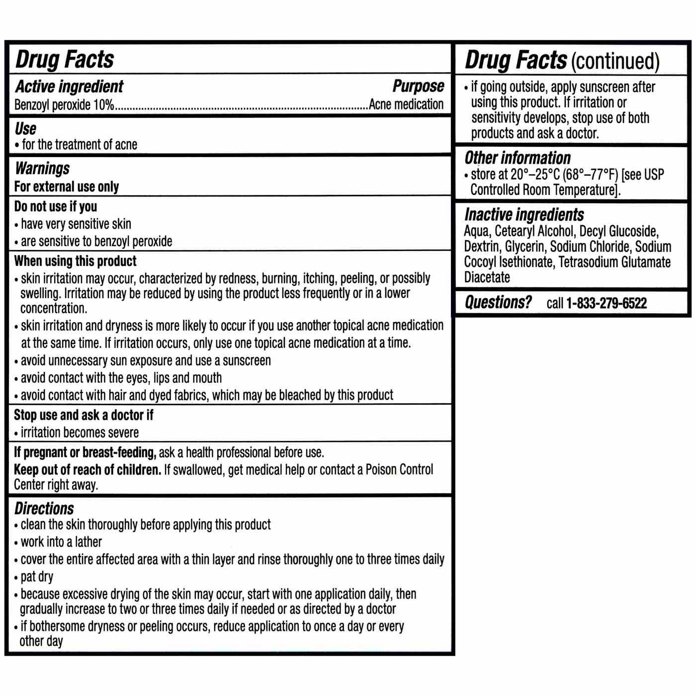 Active Ingredients: Benzoyl Peroxide (10 %), Acne medication. Inactive Ingredients: Aqua, Cetearyl Alcohol, Decyl Glucoside, Dextrin, Glycerin, Sodium Chloride, Sodium Cocoyl Isethionate, Tetrasodium Glutamate Diacetate.Allergens and safety warnings