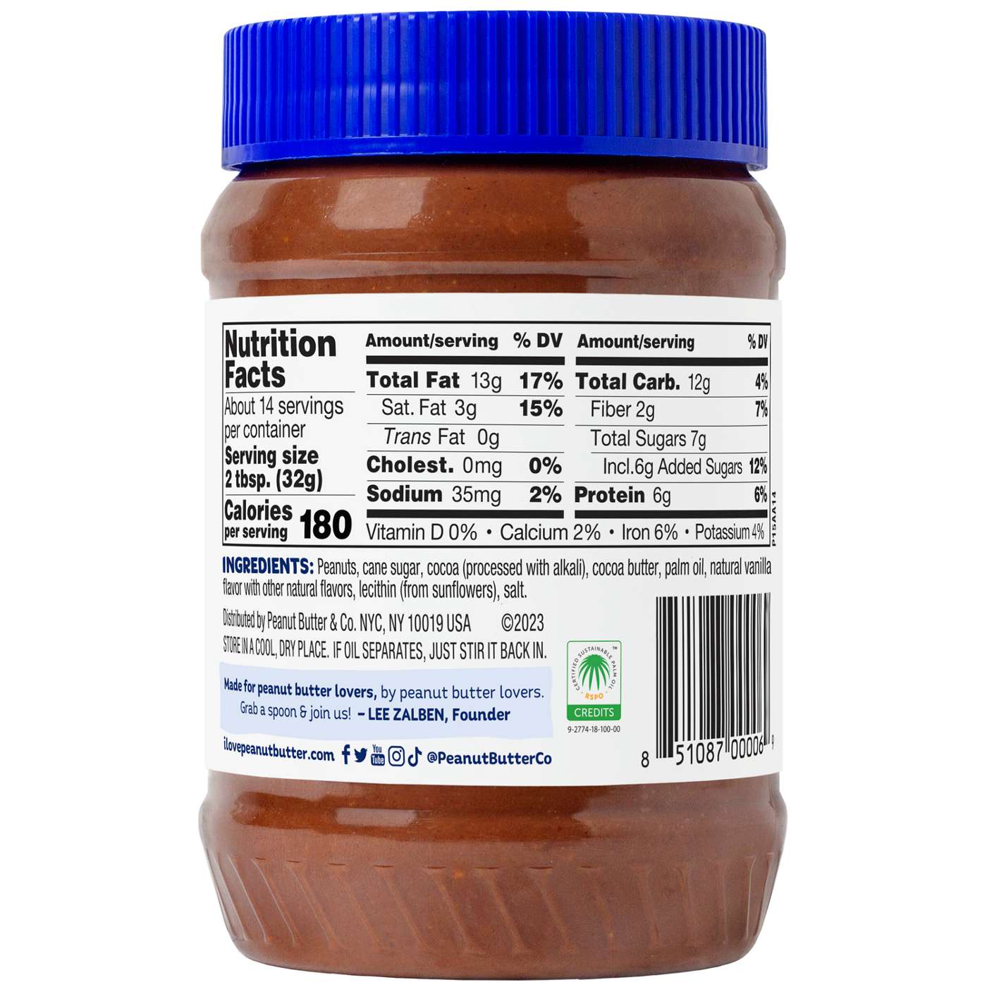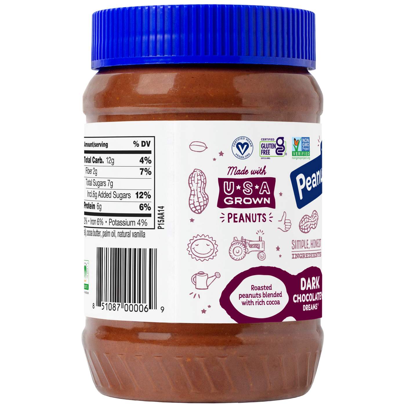 You don’t have to go to sleep to have Dark Chocolatey Dreams. This sweet and nutty spread is made from peanuts blended with cocoa, cocoa butter, cane sugar, and a pinch of salt. We've added a little bit of palm oil to keep the peanut oil from separating so that there is no need to stir. Try it on bananas, as a dip for pretzels, or grab a spoon and eat it straight from the jar!