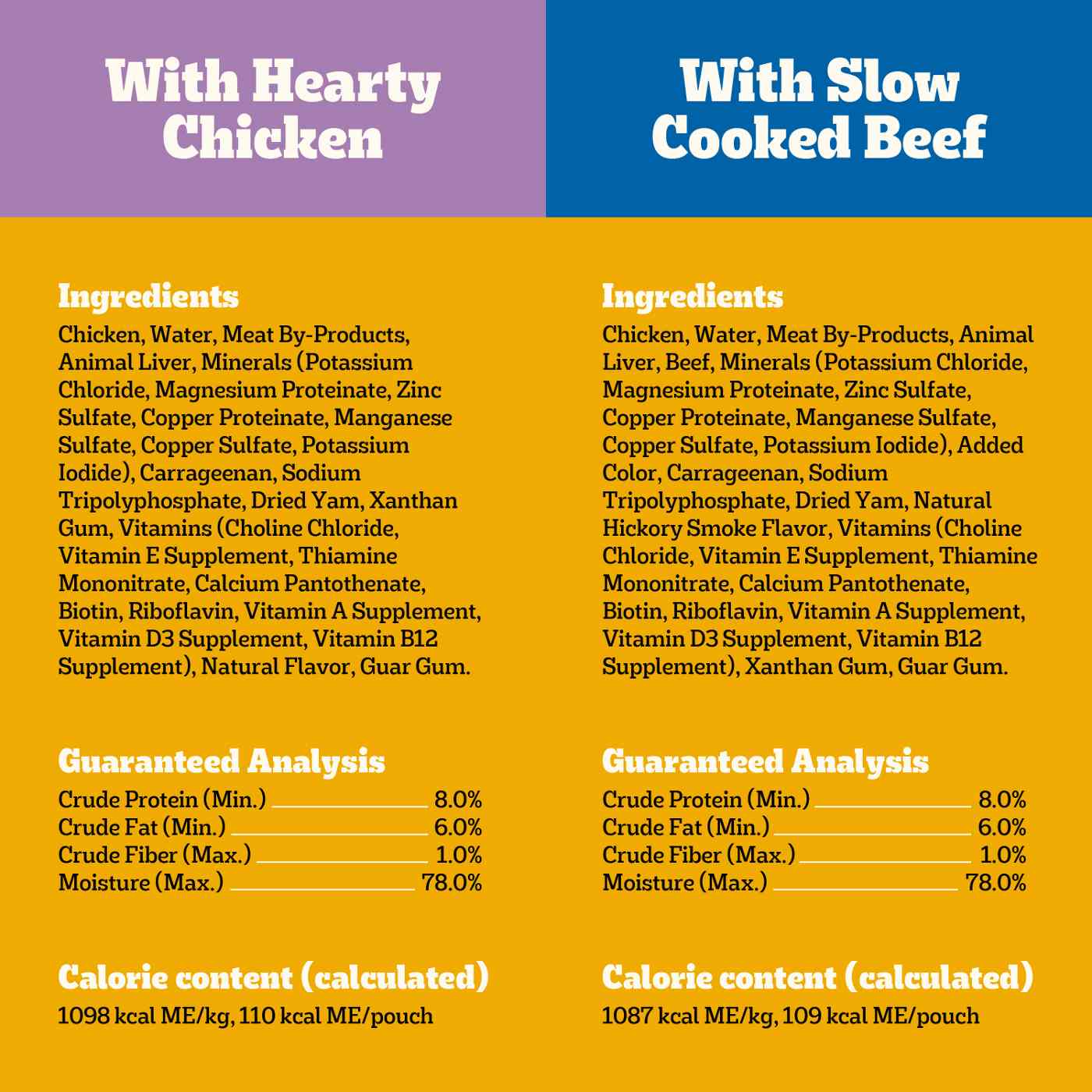 With Hearty Chicken: INGREDIENTS: Chicken, Sufficient Water For Processing, Meat By-Products, Dried Plain Beet Pulp, Potassium Chloride, Calcium Carbonate, Sodium Tripolyphosphate, Cassia Gum, Carrageenan, Guar Gum, Minerals (Magnesium Oxide, Zinc Oxide, Copper Sulfate, Calcium Iodate), Choline Chloride, Xanthan Gum, Added Color, Natural Flavor, Vitamins (Vitamin E Supplement, Thiamine Mononitrate [Vitamin B1], Pyridoxine Hydrochloride [Vitamin B6], Vitamin D3 Supplement, Folic Acid), Sodium Nitrite (For Color Retention). Bacon and Filet Mignon Flavor: INGREDIENTS: Chicken, Sufficient Water For Processing, Meat By-Products, Beef, Dried Plain Beet Pulp, Potassium Chloride, Calcium Carbonate, Sodium Tripolyphosphate, Cassia Gum, Carrageenan, Guar Gum, Minerals (Magnesium Oxide, Zinc Oxide, Copper Sulfate, Calcium Iodate), Choline Chloride, Natural Bacon Flavor, Natural Filet Mignon Flavor, Xanthan Gum, Added Color, Vitamins (Vitamin E Supplement, Thiamine Mononitrate [Vitamin B1], Pyridoxine Hydrochloride [Vitamin B6], Vitamin D3 Supplement, Folic Acid), Sodium Nitrite (For Color Retention). With Slow Cooked Beef: INGREDIENTS: Chicken, Sufficient Water For Processing, Meat By-Products, Beef, Dried Plain Beet Pulp, Potassium Chloride, Calcium Carbonate, Sodium Tripolyphosphate, Cassia Gum, Carrageenan, Guar Gum, Minerals (Magnesium Oxide, Zinc Oxide, Copper Sulfate, Calcium Iodate), Choline Chloride, Xanthan Gum, Added Color, Vitamins (Vitamin E Supplement, Thiamine Mononitrate [Vitamin B1], Pyridoxine Hydrochloride [Vitamin B6], Vitamin D3 Supplement, Folic Acid), Sodium Nitrite (For Color Retention).Allergens and safety warnings