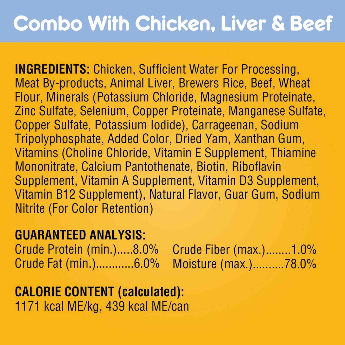 Combo INGREDIENTS: Chicken, Water, Meat By-Products, Animal Liver, Brewers Rice, Beef, Wheat Flour, Minerals (Potassium Chloride, Magnesium Proteinate, Zinc Sulfate, Sodium Selenite, Copper Proteinate, Manganese Sulfate, Copper Sulfate, Potassium Iodide), Carrageenan, Sodium Tripolyphosphate, Added Color, Dried Yam, Xanthan Gum, Vitamins (Choline Chloride, Vitamin E Supplement, Thiamine Mononitrate, Calcium Pantothenate, Biotin, Riboflavin, Vitamin A Supplement, Vitamin D3 Supplement, Vitamin B12 Supplement), Natural Flavor, Guar Gum. Beef Bacon Cheese INGREDIENTS: Chicken, Water, Meat By-Products, Brewers Rice, Beef, Wheat Flour, Minerals (Potassium Chloride, Magnesium Proteinate, Zinc Sulfate, Sodium Selenite, Copper Proteinate, Manganese Sulfate, Copper Sulfate, Potassium Iodide), Dried Cheese, Carrageenan, Sodium Tripolyphosphate, Dried Yam, Added Color, Xanthan Gum, Vitamins (Choline Chloride, Vitamin E Supplement, Thiamine Mononitrate, Calcium Pantothenate, Biotin, Riboflavin, Vitamin A Supplement, Vitamin D3 Supplement, Vitamin B12 Supplement), Natural Bacon Flavor, Guar Gum.Allergens and safety warnings