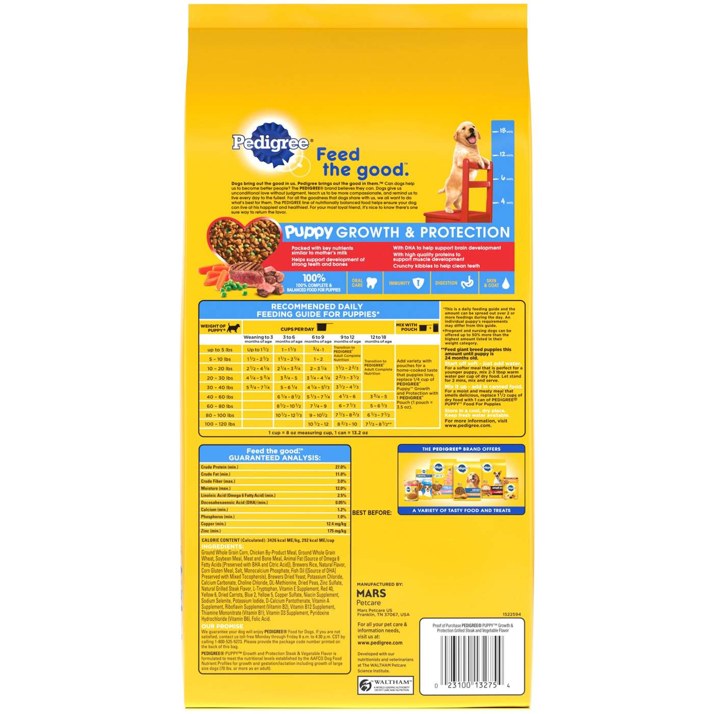Dogs bring out the good in us. Pedigree brings out the good in them. Express your love to your dog by serving Pedigree Puppy Dry Puppy Food, Grilled Steak and Vegetable Flavor. This great-tasting dry puppy food recipe is specifically designed for puppies, made with high-quality protein sources to support muscle development, and is fortified with vitamins and minerals to support a healthy immune system. Pedigree Puppy Dry Puppy Food, Grilled Steak and Vegetable Flavor is also 100% complete and balanced for puppies and is made with key nutrients similar to mother’s milk, so you can feel confident your puppy is getting a high-quality meal. To support your puppy’s health and vitality, this dry puppy food recipe is formulated with 36 vitamins, minerals, and amino acids. With no high fructose corn syrup, artificial flavors, or added sugars, Pedigree Puppy Puppy Dry Dog Food, Grilled Steak and Vegetable Flavor shows your puppy that you care…and have great taste.High-Quality Protein: This dry puppy food is made with high-quality protein sources to support muscle development in growing pups.Quality Nutrition: This dry puppy food recipe is made with 36 vitamins, minerals, and amino acids to support your puppy’s health and vitality.Immune Health: Pedigree Puppy Dry Puppy Food, Grilled Steak and Vegetable Flavor is fortified with vitamins & minerals to support a healthy immune system.Complete and Balanced: Pedigree Puppy Dry Puppy Food, Steak and Vegetable Flavor is specifically designed for puppies and is 100% complete and balanced food for puppies, bringing a nutritious meal to your pet.Quality Recipe: This dry puppy food recipe is crafted with no high fructose corn syrup, artificial flavors, or added sugar.Contains one (1) 3.5 lb. Bag of Pedigree Puppy Dry Puppy Food, Grilled Steak and Vegetable Flavor.