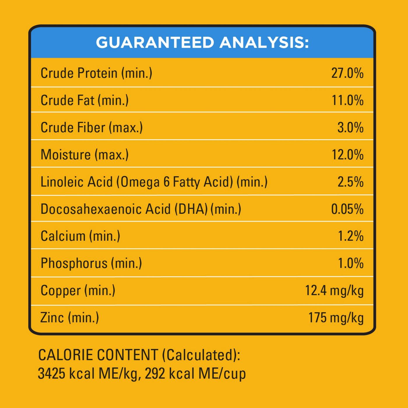 INGREDIENTS: Ground Whole Grain Corn, Chicken By-Product Meal, Ground Whole Grain Wheat, Soybean Meal, Brewers Rice, Animal Fat (Source of Omega 6 Fatty Acids [Preserved with BHA and Citric Acid]), Meat and Bone Meal, Natural Flavor (Source of Chicken Flavor), Dried Brewers Yeast, Salt, Monocalcium Phosphate, Fish Oil ([Source of DHA] Preserved with Mixed Tocopherols), Dried Plain Beet Pulp, Potassium Chloride, Calcium Carbonate, Choline Chloride, DL-Methionine, Dried Peas, Zinc Sulfate, L-Tryptophan, Vitamin E Supplement, Red 40, Dried Carrots, Yellow 5, Blue 2, Copper Sulfate, Yellow 6, Niacin Supplement (Vitamin B3), Sodium Selenite, Potassium Iodide, D-Calcium Pantothenate (Vitamin B5), Vitamin A Supplement, Riboflavin Supplement (Vitamin B2), Vitamin B12 Supplement, Thiamine Mononitrate (Vitamin B1), Vitamin D3 Supplement, Pyridoxine Hydrochloride (Vitamin B6), Folic Acid