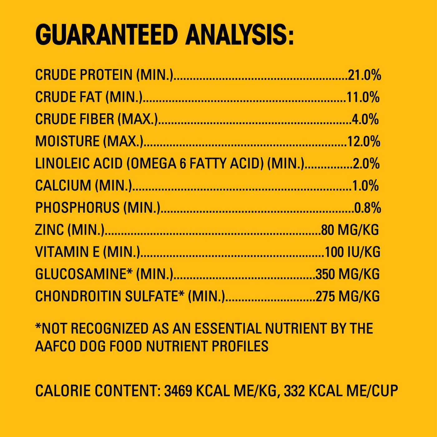 Nutrients: Crude Protein min 21.0 %; Crude Fat min 11.0 %; Crude Fiber max 4.0 %; Moisture max 12.0 %; Linoleic Acid (Omega 6 Fatty Acid) min 1.5 %; Calcium min 1.0 %; Phosphorus min 0.8 %; Zinc min 80 mg/kg; Vitamin E min 100 IU/kg; Glucosamine min 350 mg/kg; Chondroitin Sulfate min 275 mg/kg. Not recognized as an essential nutrient by the AAFCO Dog Food Nutrient Profiles. .