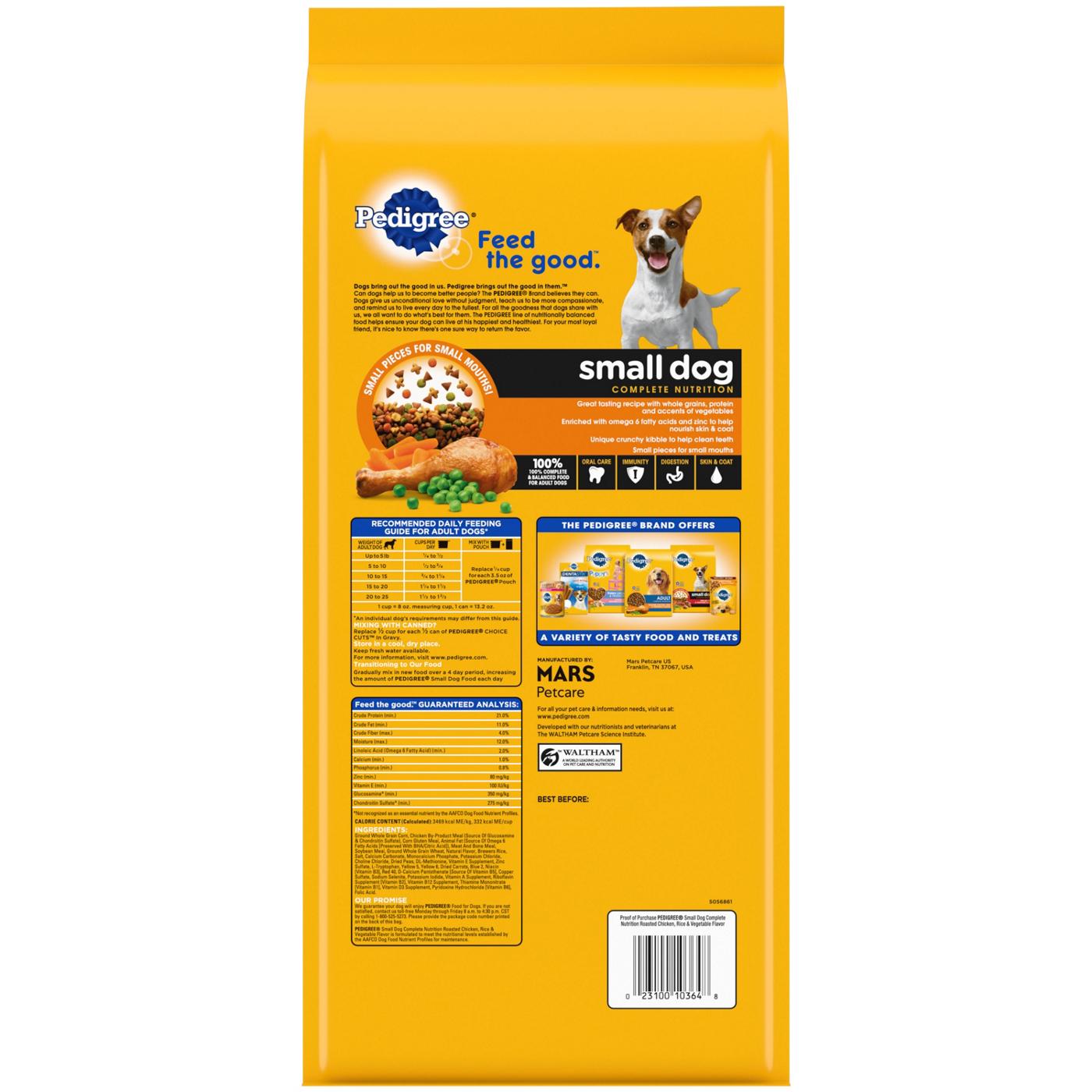 Dogs bring out the good in us. Pedigree brings out the good in them. Express your love for your dog by serving Pedigree Complete Nutrition Adult Small Dog Dry Dog Food, Roasted Chicken, Rice & Vegetable Flavor recipe. This great-tasting dry dog food recipe is made with small pieces to meet the unique needs of your small breed dog and contains whole grains, protein, and accents of vegetables. To support your dog’s health and vitality, this small breed dry dog food recipe is formulated with 36 vitamins, minerals, and amino acids. It also contains Omega 6 Fatty Acid and Zinc to help nourish a healthy skin and coat. With no high fructose corn syrup, artificial flavors, or added sugars, Pedigree Complete Nutrition Adult Small Dog Dry Dog Food, Roasted Chicken, Rice & Vegetable Flavor shows your dog that you care…and have great taste.Designed for Small Breeds: This dry dog food recipe is made with small pieces for small mouths, meeting the unique needs of your small breed dog.Great Tasting: Pedigree Complete Nutrition Adult Small Dog Dry Dog Food, Grilled Steak and Vegetable Flavor is a great-tasting recipe with whole grains, protein, and accents of vegetables.Quality Nutrition: This dry dog food recipe is made with 36 vitamins, minerals, and amino acids to support your dog’s health and vitality.Supports Healthy Skin and Coat: Pedigree Complete Nutrition Adult Small Dog Dry Dog Food, Grilled Steak and Vegetable Flavor is enriched with Omega 6 Fatty Acid and Zinc to help nourish a healthy skin and coat.Quality Recipe: This dry dog food recipe is crafted with no high fructose corn syrup, artificial flavors, or added sugar.Contains one (1) 3.5 lb. Bag of Pedigree Complete Nutrition Adult Small Dog Dry Dog Food, Grilled Steak and Vegetable Flavor.