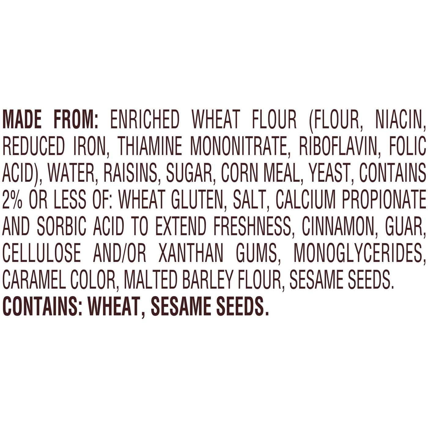 Made from: Enriched Wheat Flour (Flour, Niacin, Reduced Iron, Thiamine Mononitrate, Riboflavin, Folic Acid), Water, Raisins, Sugar, Corn Meal, Yeast, Contains 2% or Less of Wheat Gluten, Salt, Calcium Propionate and Sorbic Acid to Extend Freshness, Cinnamon, Guar Cellulose and/or Xanthan Gums, Monoglycerides, Caramel Color, Malted Barley Flour, Sesame Seeds.Allergens and safety warnings