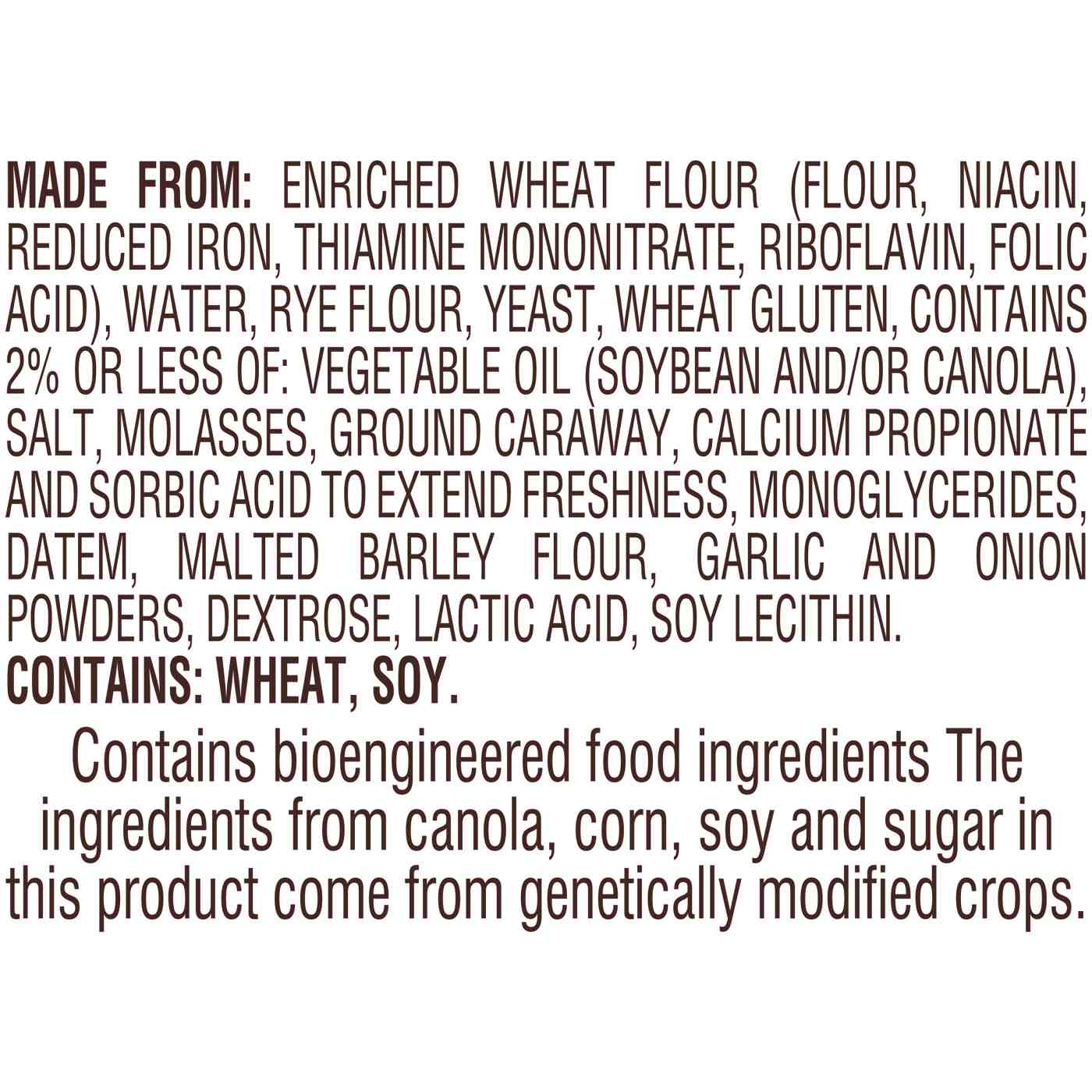 Made from: Enriched Wheat Flour (Flour, Niacin, Reduced Iron, Thiamine Mononitrate, Riboflavin, Folic Acid), Water, Rye Flour, Yeast, Wheat Gluten, Contains 2% or Less of: Vegetable Oil (Soybean and/or Canola), Salt, Molasses, Ground Caraway, Calcium Propionate and Sorbic Acid to Extend Freshness, Monoglycerides, DATEM, Malted Barley Flour, Garlic and Onion Powders, Dextrose, Lactic Acid, Soy Lecithin.Allergens and safety warnings
