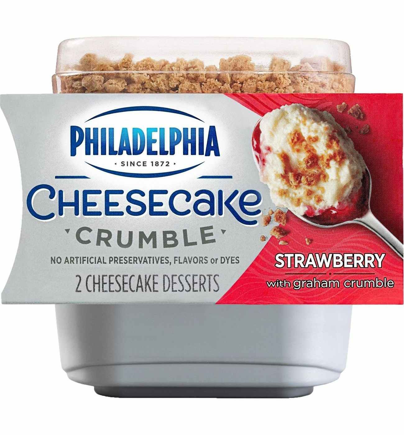 PHILADELPHIA Cheesecake Crumble Strawberry Desserts is a personal serving of creamy PHILADELPHIA Cheesecake base with graham crumbles and strawberry sauce. Each dessert is made with no artificial preservatives, flavors, or dyes. Just open the convenient Philadelphia Cheesecake Crumble cups, pour the graham crumbles on top, mix and dig into a delicious indulgent dessert. It's the perfect easy dessert for one that can be enjoyed anytime, anywhere. Each package comes with two strawberry dessert cups that are just too good to be shared.• 2 PHILADELPHIA Cheesecake Crumble Strawberry Cheesecake Desserts• Our single serve PHILADELPHIA Cheesecake Crumble dessert contains strawberry sauce and real graham crumbles• A delicious 3-layer cheesecake with strawberry sauce on the bottom, a rich and creamy cheesecake filling and graham cracker crumbles on top for a perfectly indulgent after dinner treat• Made with no artificial preservatives, flavors, or dyes• Just open the convenient PHILADELPHIA Cheesecake Crumble dessert, pour the graham crumbles on top, mix and enjoy• Served in a personal dessert cup that's just too good to be shared• The perfect dessert for one• SNAP & EBT eligible food item