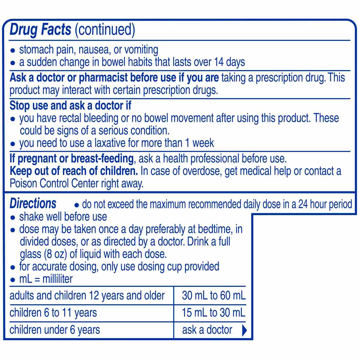In Each 15 ml: Warnings: Ask a doctor before use if you have: kidney disease; a magnesium-restricted diet; stomach pain, nausea, or vomiting; a sudden change in bowel habits that lasts over 14 days. Ask a doctor or pharmacist before use if you are taking a prescription drug, This product may interact with certain prescription drugs. Stop use and ask a doctor if: you have rectal bleeding or no bowel movement after using this product. These could be signs of a serious condition; you need to use a laxative for more than 1 week. If pregnant or breast-feeding, ask a health professional before use. Keep out of reach of children. In case of overdose, get medical help or contact a Poison Control Center right away. Purchase only if neckband printed with stimulant free is intact.