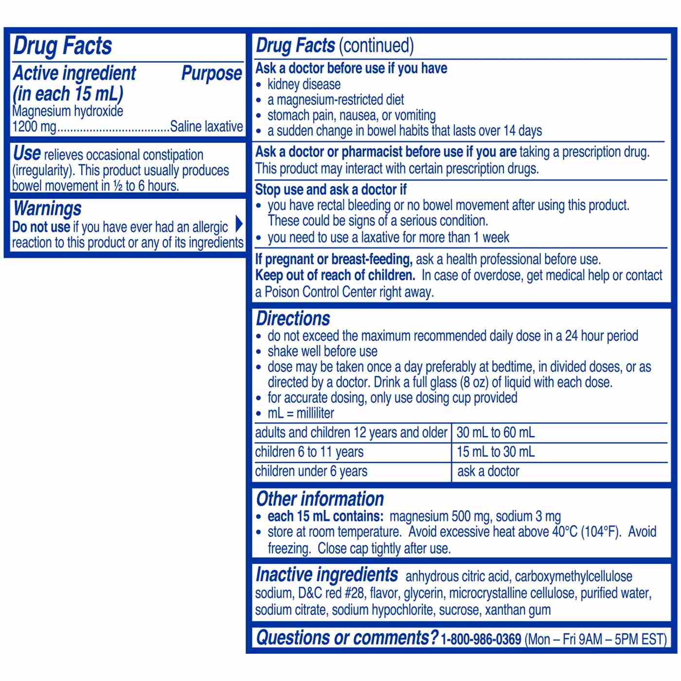 Active Ingredients: In Each 15 ml Tablespoon: Magnesium Hydroxide (1200 mg). Purpose: Saline Laxative. Inactive Ingredients: Anhydrous Citric Acid, Carboxymethylcellulose Sodium, D&C Red 28, Flavor, Glycerin, Microcrystalline Cellulose, Purified Water, Sodium Citrate, Sodium Hypochlorite, Sucrose, Xanthan Gum.Allergens and safety warnings