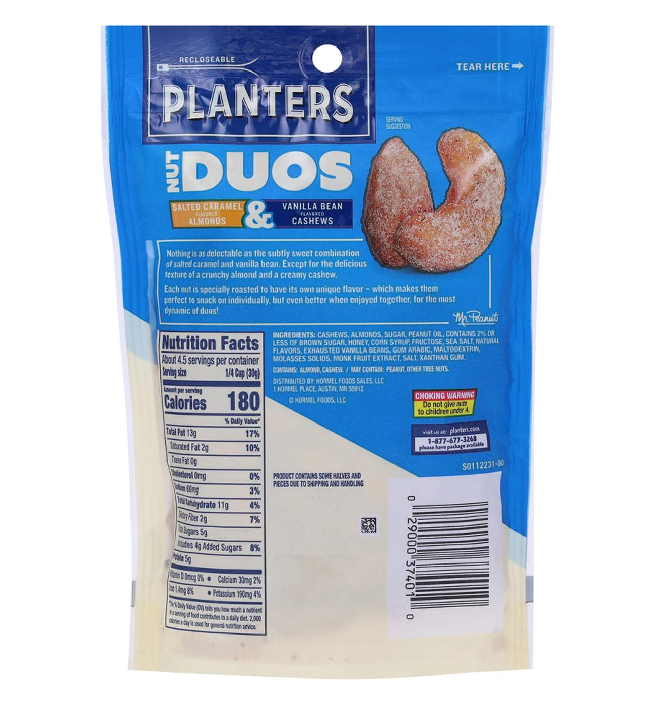 Nothing is as delectable as the subtly sweet combination of salted caramel and vanilla bean- except for the delicious texture of a crunchy almond and a creamy cashew. Each nut is specially roasted to have its own unique flavor - which makes them perfect to snack on individually, but even better when enjoyed together, for the most dynamic of duos. Help fuel your day with 5 grams of plant-based protein and 180 calories per serving. With irresistible flavors and crunchy textures, they’re perfect for every snacking moment. Pull out a bag when you’re kickin’ it with friends, pair with your favorite savory or sweet snacks, share with friends on a road trip, or dig in for a snack session during your next TV binge. With this easy resealable bag, you can take these nuts with you wherever you go. Get snackin’ with PLANTERS Nut Duos Salted Caramel Almonds & Vanilla Bean Cashews. All trademarks, logos and images are owned by Hormel Foods Corporation, its subsidiaries and affiliates. Copyright Hormel Foods, LLC