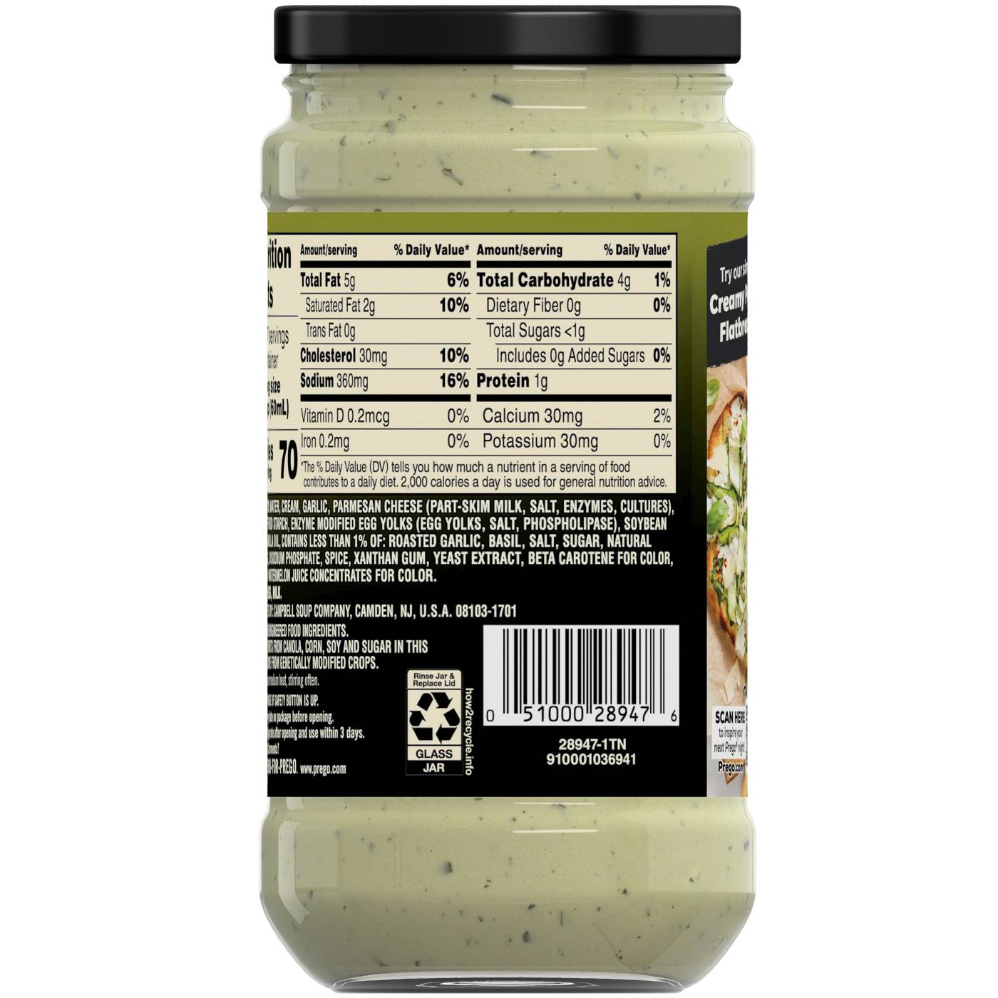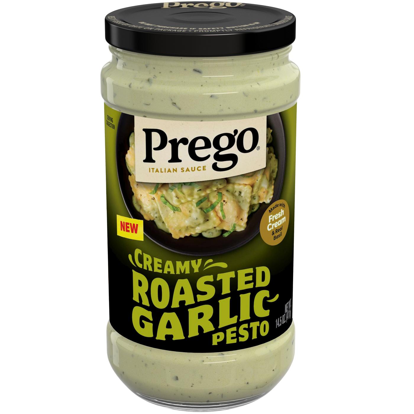 Be the hero at dinner with Prego® Creamy Roasted Garlic Pesto Pasta Sauce. Prego® Creamy Roasted Garlic Pesto Sauce is made with fresh cream, Parmesan cheese, real basil and roasted garlic for a unique twist on a classic. Combining the creaminess of Alfredo sauce with the bright, herby taste of pesto, this versatile cream sauce is a rich and flavorful addition to any dish. Toss it with your favorite pasta for an easy, comforting meal, or use it in recipes like Creamy Pesto Flatbreads.