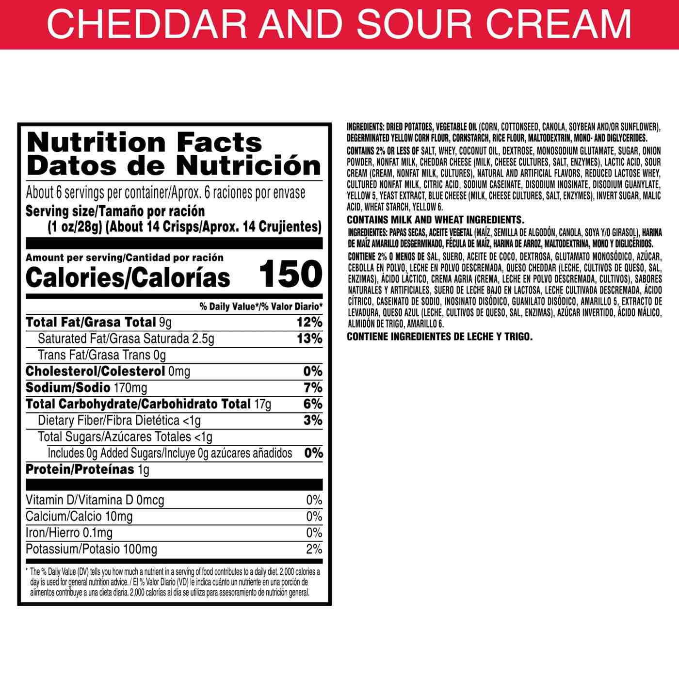 Dried Potatoes, Vegetable Oil (Corn, Cottonseed, Canola, Soybean And/Or Sunflower), Degerminated Yellow Corn Flour, Cornstarch, Rice Flour, Maltodextrin, Mono- And Diglycerides. Contains 2% Or Less Of Salt, Whey, Coconut Oil, Dextrose, Monosodium Glutamate, Sugar, Onion Powder, Nonfat Milk, Cheddar Cheese (Milk, Cheese Cultures, Salt, Enzymes), Lactic Acid, Sour Cream (Cream, Nonfat Milk, Cultures), Natural And Artificial Flavors, Reduced Lactose Whey, Cultured Nonfat Milk, Citric Acid, Sodium Caseinate, Disodium Inosinate, Disodium Guanylate, Yellow 5, Yeast Extract, Blue Cheese (Milk, Cheese Cultures, Salt, Enzymes), Invert Sugar, Malic Acid, Wheat Starch, Yellow 6.