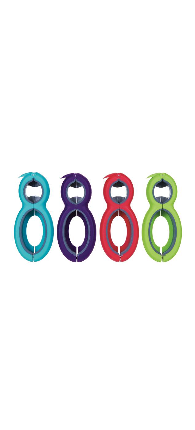 This unique opener opens 6 different seals and lids. It has a hidden blade that zips open bags, and a clamp that opens safety seals. For beverages, use the pull tab opener, pop off a bottle cap, or open screw caps. It can also be used for opening various sizes of jar lids. It is durable, has a comfort grip and is dishwasher safe.