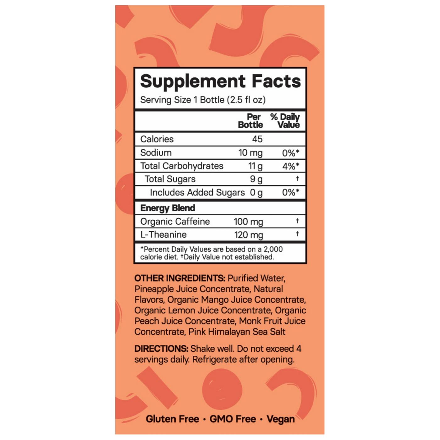 Purified Water, Pineapple Juice Concentrate, Natural Flavors, Organic Mango Juice Concentrate, Organic Lemon Juice Concentrate, Organic Peach Juice Concentrate, L-Theanine, Monk Fruit Juice Concentrate, Organic Caffeine, Pink Himalayan Sea SaltAllergens and safety warnings