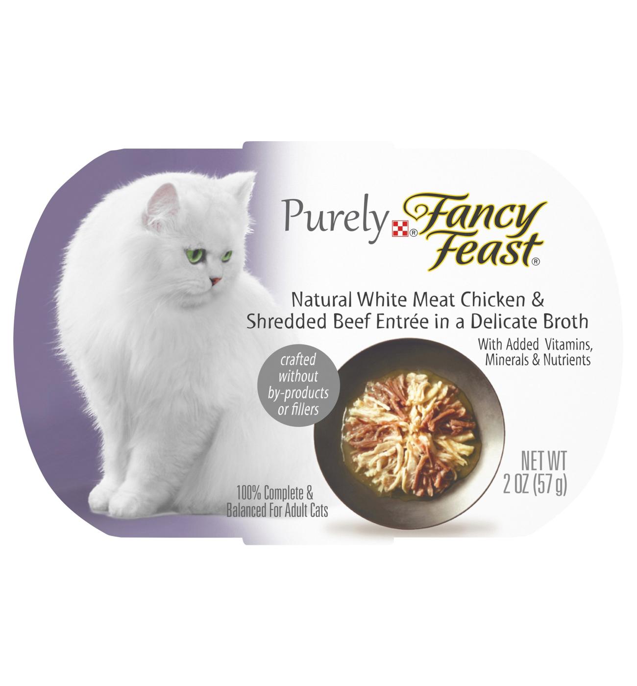 With added vitamins, minerals & nutrients. Crafted without by-product or fillers. 100% complete & balanced for adult cats. Thoughtfully crafted meal in a delicate broth. purina.com. Please recycle. This paperboard carton [paperboard may not be recyclable in your area]. Product of Thailand. Calorie Content (ME, calculated) 885 kcal/kg 50 kcal/tray Purely fancy feast natural white meat chicken entree & shredded beef is formulated to meet the nutritional levels established by the AAFCO cat food nutrient profiles for maintenance of adult cats.