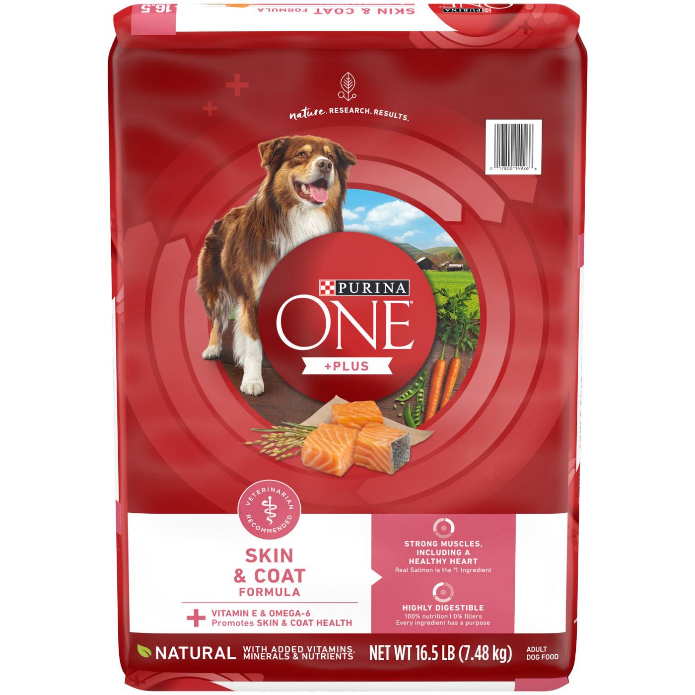 See the difference a SmartBlend of ingredients can make when you feed your dog Purina ONE +Plus Natural Skin & Coat Formula with added vitamins, minerals and nutrients adult dry dog food. This high protein dog food features real salmon as the #1 ingredient, and when combined with rice, oatmeal and other high-quality ingredients, delivers easy-to-digest nutrition for your dog. Crafted by a veterinarian-recommended brand in Purina-owned, U.S. facilities, our salmon natural dog food recipe has no artificial colors, flavors or preservatives. The wholesome formula also contains vitamin E and omega-6 fatty acids to promote your dog's skin and coat health. With 100% nutrition for adult dogs and 0% fillers, every ingredient in this skin and coat dog food has a purpose. High protein in every serving helps to support your dog's strong muscles, including a healthy heart, and natural sources of glucosamine help support joint health so he can maintain his active lifestyle. Our premium dog food for sensitive skin features calcium-rich crunchy kibble to deliver the taste and texture he loves while supporting strong teeth and healthy gums. Give your adult dog 100% complete and balanced nutrition to support his lifelong whole-body health when you fill his bowl with this Purina sensitive skin and stomach dog food.