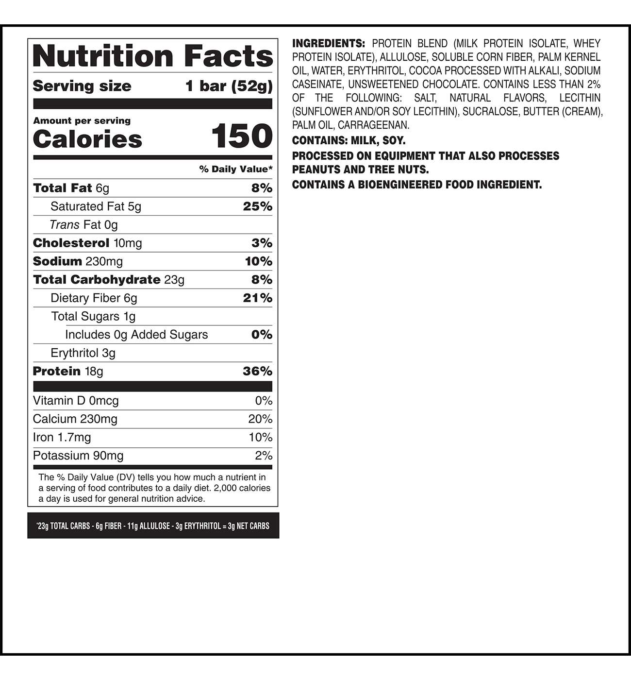 Protein Blend (Milk Protein Isolate, Whey Protein Isolate), Allulose, Soluble Corn Fiber, Palm Kernel Oil, Water, Erythritol, Cocoa Processed with Alkali, Sodium Caseinate, Unsweetened Chocolate, Contains Less than 2% of the Following: Sea Salt, Natural Flavors, Lecithin (Sunflower and/or Soy Lecithin), Sucralose, Butter (Cream), Palm Oil, Carrageenan.Allergens and safety warnings