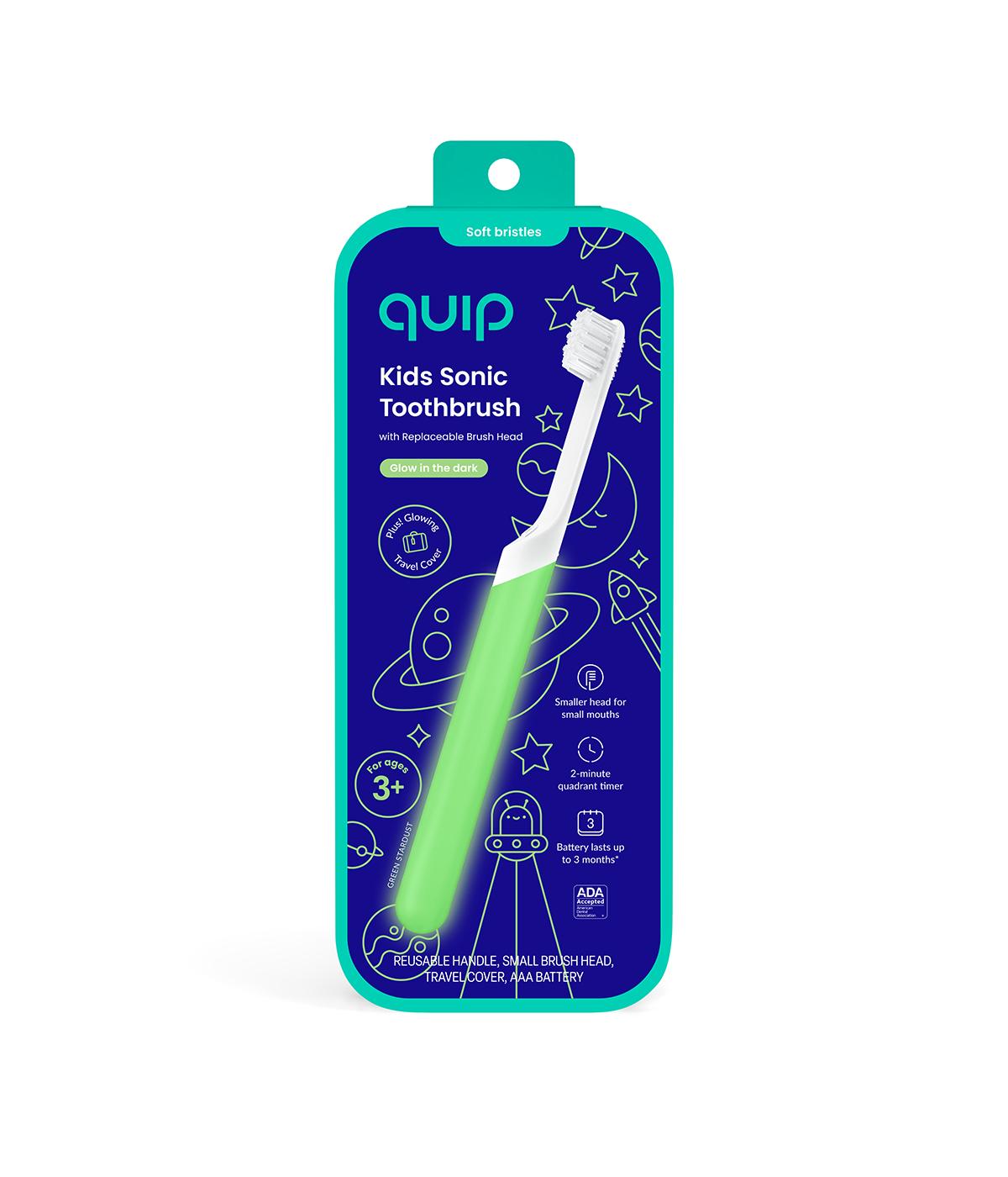 A grown-up brush for kids. The quip Kids Electric Toothbrush Starter Kit makes better brushing habits simple and sustainable with a premium handle you keep for life, a small replaceable brush head (soft bristles, tongue scraper on back), a replaceable AAA battery, and a multi-use travel cover that doubles as a stand and mirror mount. Unlike some kids electric brushes that are big and bulky, quip is slim and lightweight with a rubber grip for greater control, and a sized-down brush head to easily clean small mouths. Simply press the "q" button to power a gentle, effective clean with all the guiding features dentists recommend: sensitive sonic vibrations, 2-minute timer, 30-second pulses. The sleek, travel-ready design easily packs into any pocket, bag or backpack for on the go. Plus, it's water-resistant and shower-safe. For ages 3+. Adult supervision advised for under 8. Reusable product - replaceable brush head to reduce waste.