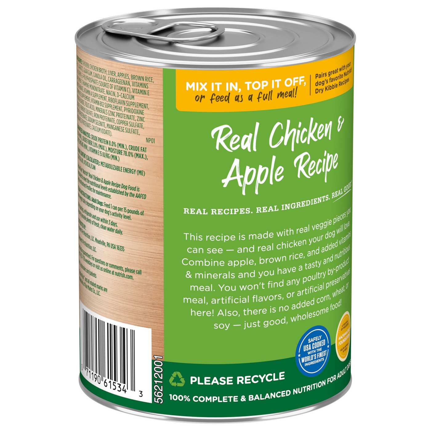 This recipe is made with real veggie pieces you can see - and real chicken your dog will love. Combine apple, brown rice, and added vitamins & minerals and you have a tasty and nutritious meal. You won’t find any poultry by-product meal, artificial flavors, or artificial preservatives here! Also, there is no added corn, wheat, or soy - just good, wholesome food! 100% Complete & balanced nutrition for adult dogs.