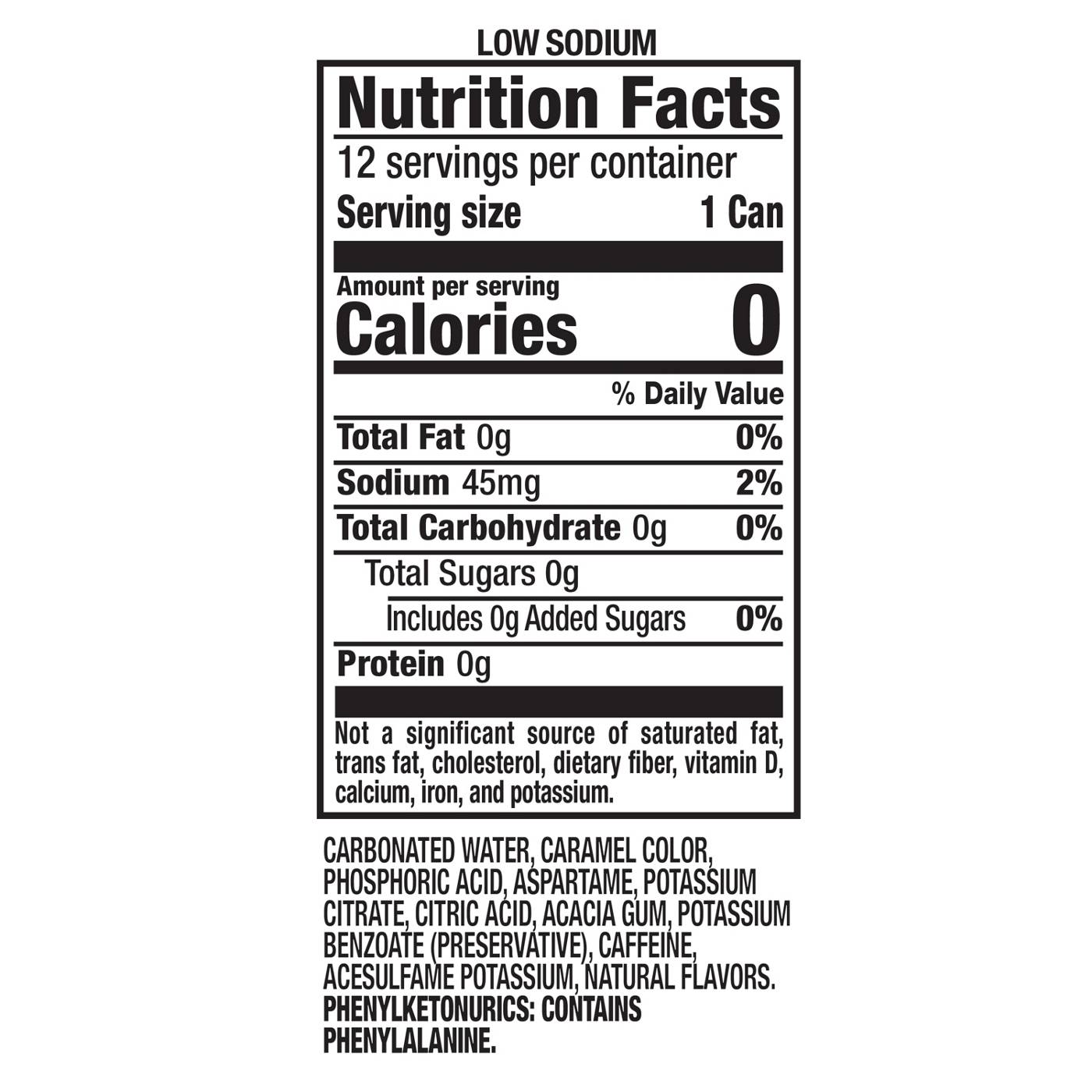 Carbonated Water, Caramel Color, Phosphoric Acid, Aspartame, Potassium Citrate, Citric Acid, Acacia Gum, Potassium Benzoate (Preservative), Caffeine, Acesulfame Potassium, Natural Flavors.Allergens and safety warnings