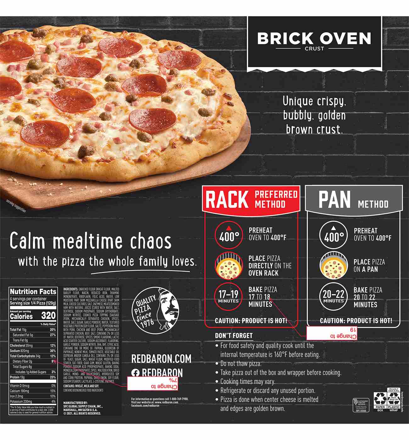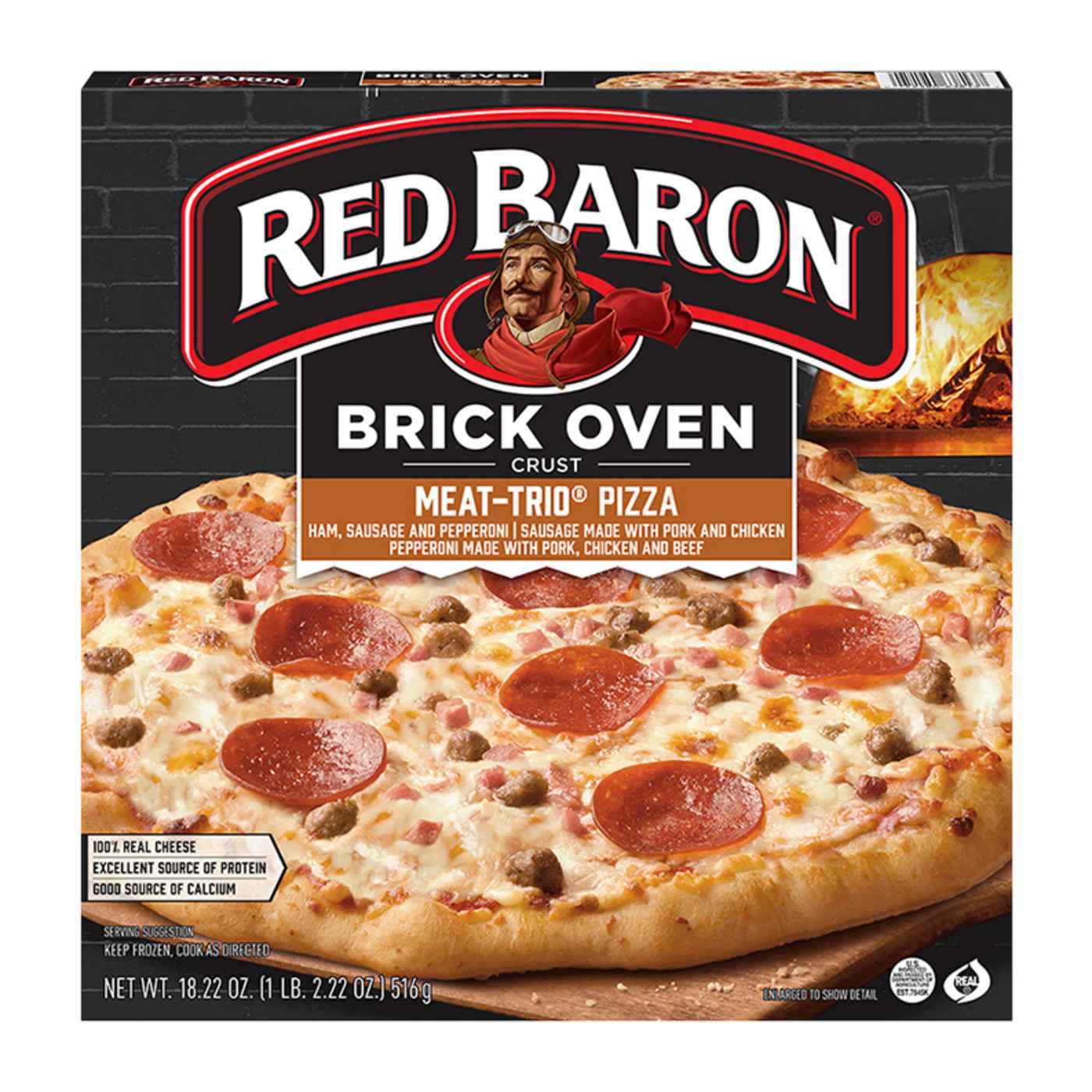 One bite into RED BARON Brick Oven MEAT-TRIO pizza and you know this will be a moment to remember. Savor the mouthwatering taste of zesty tomato sauce, 100% real cheese and a hearty topping of ham, sausage and pepperoni all piled on top of a perfect Brick Oven Crust that is crispy, bubbly, and golden brown. It's an excellent source of protein and a good source of calcium so you can feel good about every single slice you serve. Whether it's part of a mid-week family dinner, a late-night study session with friends, or a quick snack before sports practice, let our frozen pizzas help you and the people you love savor every moment. Easy to make and easier to enjoy, this frozen pizza serves up quality and flavor in minutes so you can get back to what matters. Just bake this frozen pizza on the oven rack for 17-19 minutes at 400°F and you're ready to serve a sizzling, melty and perfectly crispy MEAT-TRIO pizza that will satisfy everyone around your table. Keep pizza frozen until you're ready to enjoy. No matter the occasion, you can count on RED BARON pizza to please the crowd. You can quickly bake our frozen pizza as part of an easy dinner, giving your family more time to catch up over every cheese and meat-packed bite. Everyone at your next pizza party will buzz about the perfect crust that's irresistibly crispy and bubbly. And you'll feel the pride and excitement that comes with bringing people together to share a delicious meal and lots of memorable moments, again and again. Make your next meal mean more with a RED BARON Brick Oven MEAT-TRIO Pizza!