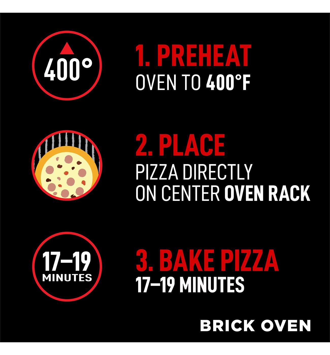 • Made with zesty tomato sauce, 100% real cheese, ham, sausage and pepperoni• Authentic Brick Oven crust is crispy, bubbly, and bakes to golden brown• Excellent source of protein and a good source of calcium• Easy to enjoy - just bake frozen pizza on the oven rack at 400°F for 17 -19 minutes• Just a freezer away, our mouthwatering pizza is always within reach• Perfect as part of any meal or occasion and ideal for sharing with family and friends