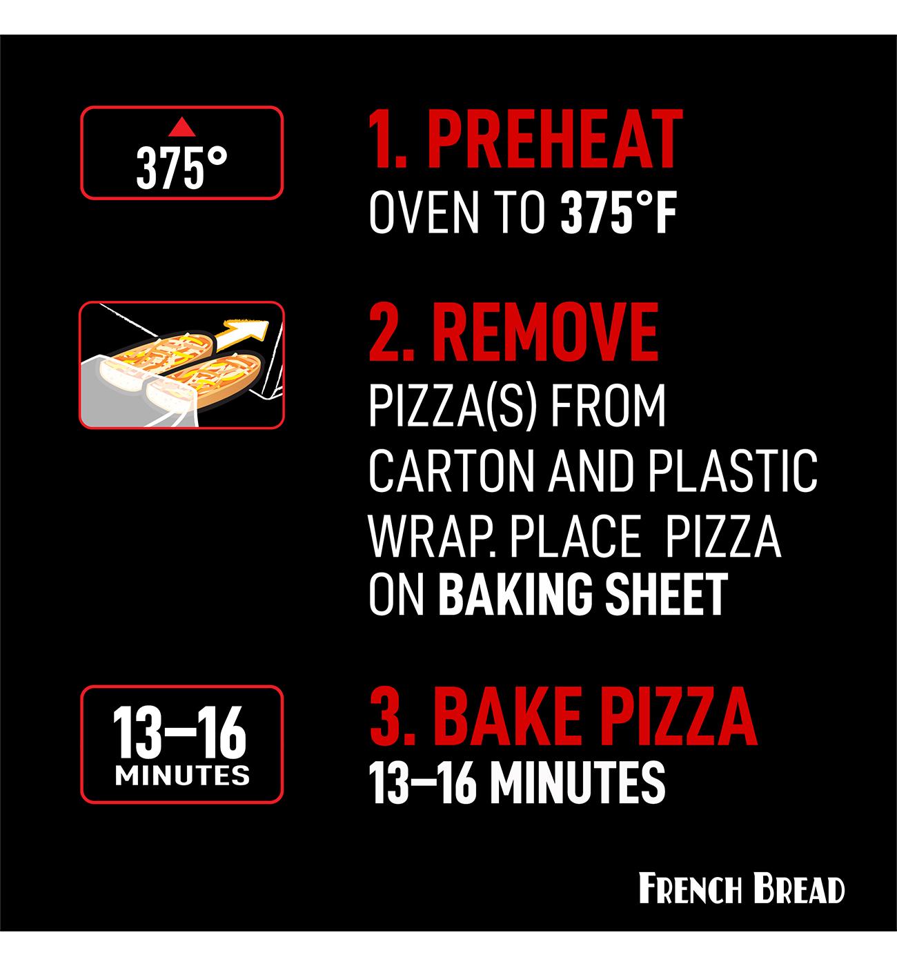 • Made with savory garlic sauce, 100% real mozzarella, yellow & white cheddar, provolone, and parmesan cheese• Authentic French bread crust is crispy on the outside, soft on the inside• Excellent source of protein and calcium• Easy to enjoy - bake frozen pizza in the oven at 375°F for 13-16 minutes• Just a freezer away, our French bread pizza singles are always within reach