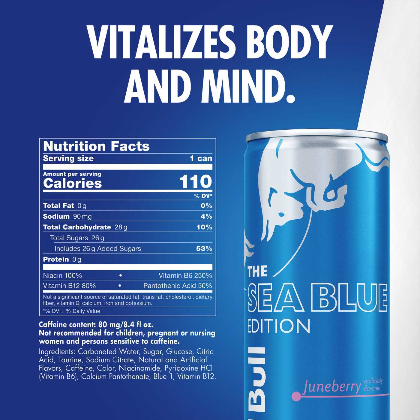 This Red Bull Sea Blue Edition features the enticing berry taste of Juneberry flavor. This lightly carbonated beverage is enjoyed worldwide by fitness enthusiasts, athletes, gamers, students and travelers. A refreshing can of Red Bull makes an excellent partner for busy, active lifestyles. Each 8.4 fl oz can contains 80mg of caffeine per serving (about the same amount as a home-brewed cup of coffee) and 26g of sugar (comparable to sugar levels found in apple juice). It also includes Taurine, an amino acid naturally occurring in the human body, and B-group vitamins B6, B12, Niacin (B3) and Pantothenic Acid (B5). Available in 4-packs, 12-packs, 24-packs and Variety Packs. Comes in aluminum cans that can be recycled over and over. Always check can labels for most updated product nutritional and ingredient information. Calcium and sugars values declared on labels may vary slightly depending on production locations.