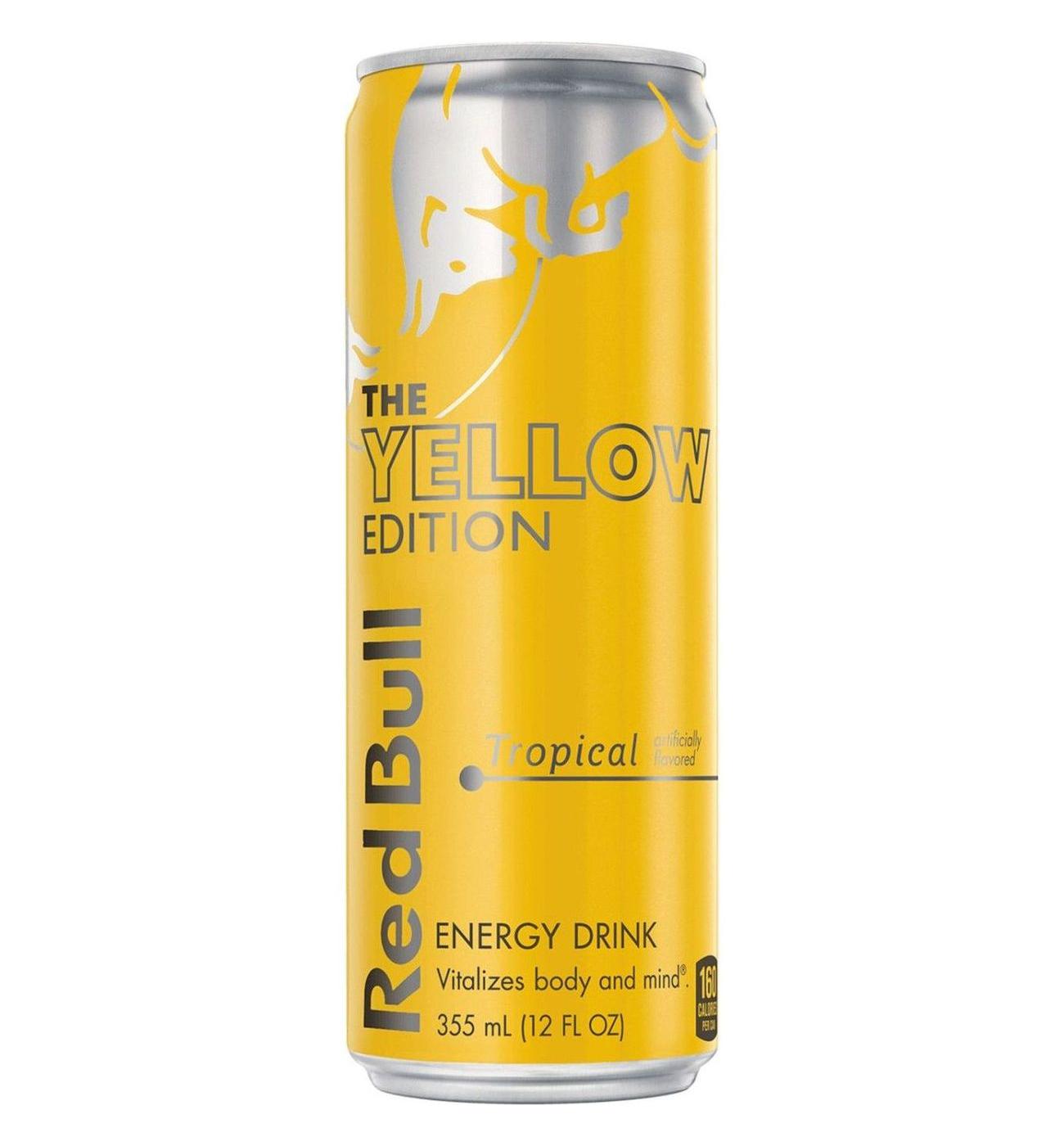This Red Bull Yellow Edition features the exotic taste of tropical fruit. This lightly carbonated beverage is enjoyed worldwide by fitness enthusiasts, athletes, gamers, students and travelers. A refreshing can of Red Bull makes an excellent partner for busy, active lifestyles. Each 12 fl oz can contains 114mg of caffeine per serving and 39g of sugar (comparable to sugar levels found in apple juice). It also includes Taurine, an amino acid naturally occurring in the human body, and B-group vitamins B6, B12, Niacin (B3) and Pantothenic Acid (B5). Available in 4-packs, 12-packs, 24-packs and Variety Packs. Comes in aluminum cans that can be recycled over and over. Always check can labels for most updated product nutritional and ingredient information. Calcium and sugars values declared on labels may vary slightly depending on production locations.
