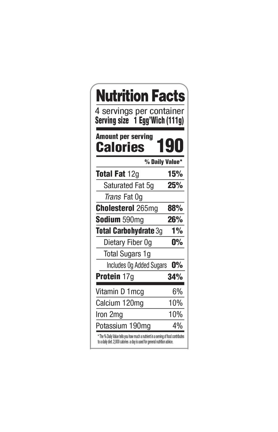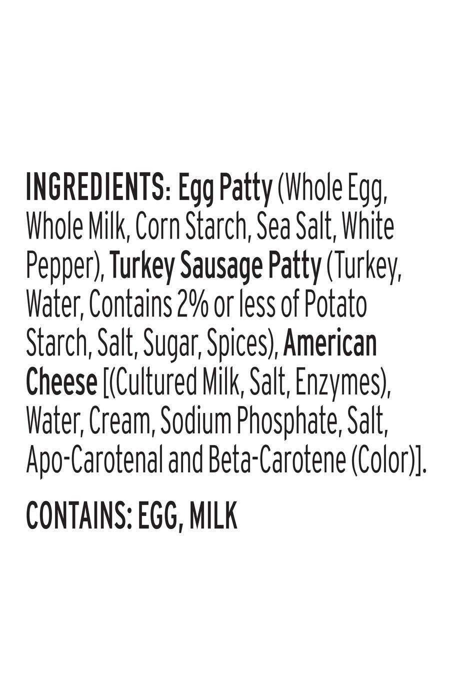 Egg Patty (Whole Egg, Whole Milk, Corn Starch, Sea Salt, White Pepper), Turkey Sausage Patty (Turkey, Water, Contains 2% or Less of Potato Starch, Salt, Sugar, Spices), American Cheese [(Cultured Milk, Salt, Enzymes), Water, Cream, Sodium Phosphate, Salt, Apo-Carotenal and Beta-Carotene (Color)].