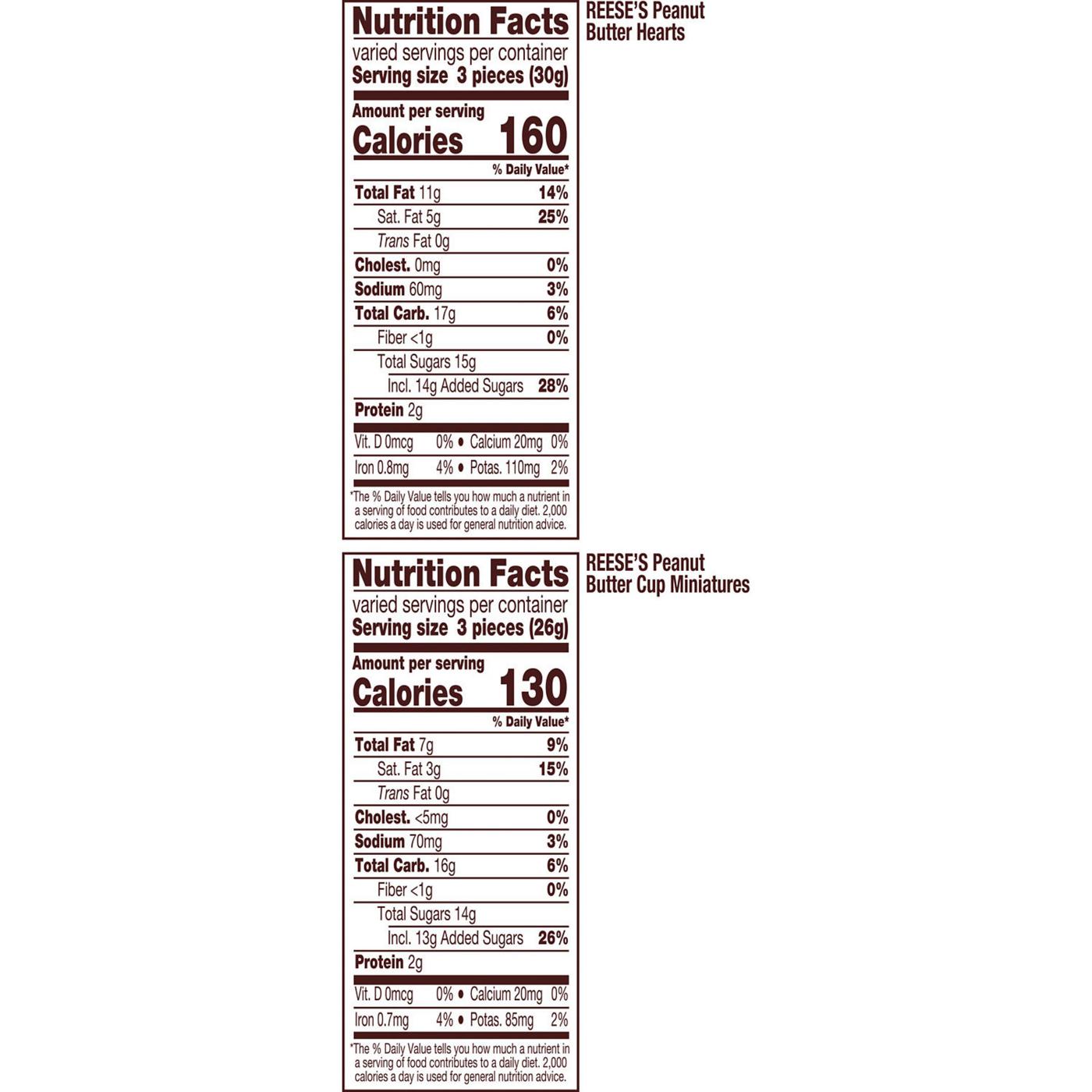 Reese's Peanut Butter Hearts: Sugar, Vegetable Oil (Palm Oil, Shea Oil, Sunflower Oil Palm Kernel Oil,&/or Safflower Oil), Peanuts, Lactose (Milk), Reduced Protein Whey (Milk), Chocolate, Dextrose, Skim Milk, Contains 2% or Less of: Cocoa Processed with Alkali, Cocoa, Hydrogenated Vegetable Oil (Palm Kernel Oil, Palm Oil), Salt, Lecithin (Soy), Vanillin (Artificial Flavor), TBHQ & Citric Acid (to Maintain Freshness). Reese's Peanut Butter Cup Miniatures: Milk Chocolate (Sugar, Cocoa Butter, Chocolate, Skim Milk, Milk Fat, Lactose, Lecithin (Soy), PGPR), Peanuts, Sugar, Dextrose, Salt, TBHQ & Citric Acid (to Maintain Freshness).Allergens and safety warnings