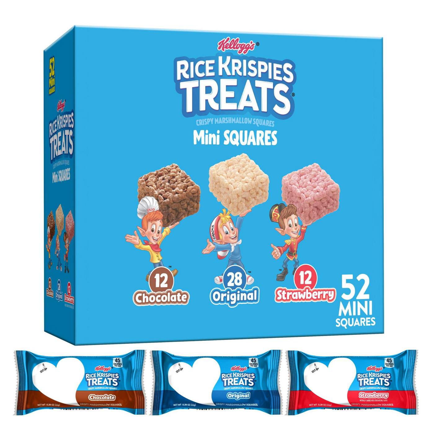 Enjoy the fun of everyday moments with the irresistible taste of Rice Krispies Treats mini crispy marshmallow squares. Create family moments with each and every delectable mini square. This variety pack includes Chocolate, Original, and Strawberry Rice Krispies Treats bars made with crispy rice cereal and the taste of soft, gooey marshmallows. Each bar is a delicious, ready-to-eat treat wherever you go; A classically delicious snack, these individually wrapped crispy rice marshmallow squares are perfect for enjoying together as a family. Great for small hands and mom-approved, take a few with you for traveling, lunchtime, dessert, at the game, and more. It's easy to share with friends and family. Rice Krispies Treats bars make a great addition to goodie bags, gift baskets, and care packages. Satisfy your sweet craving with the goodness and on-the-go convenience of Kellogg's Rice Krispies Treats mini crispy marshmallow squares.- Variety pack including Chocolate, Original, and Strawberry flavors; Perfectly proportioned, ready-to-enjoy marshmallowy treats- Enjoy puffed, oven-toasted rice cereal and the flavor of soft marshmallows; The classic, delicious small snack families love- Discover sweet flavor and crispy texture; 45 calories per bar; No high fructose corn syrup; Contains milk and soy ingredients- Pack in school lunches, snack on while playing video games, serve as an afternoon snack; Stow some in your tote bag or desk for anytime snacking- Includes 1, 20.1oz box containing 52 Kellogg's Rice Krispies Treats mini crispy marshmallow squares; Packaged for freshness and great taste- SNAP and EBT eligible item