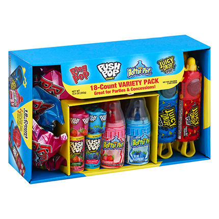 Bazooka Candy Brands 18 Count Variety Pack comes with all-time kid-favorite lollipops brands in a rainbow of kid favorite flavors, all individually-wrapped so it's easy to share. Each box includes 6 Ring Pop lollipops, 4 Push Pop lollipops, 4 Juicy Drop Pop lollipops, and 4 Baby Bottle Pop lollipops. The convenient Variety Pack box is versatile and great for kids, gifts, birthday parties, party favors, snacking, back to school, Halloween, Trick-or-Treat, Stocking Stuffers, Easter basket fillers, summer celebrations, and concessions. Disclaimer: Not for children 3 and under.
