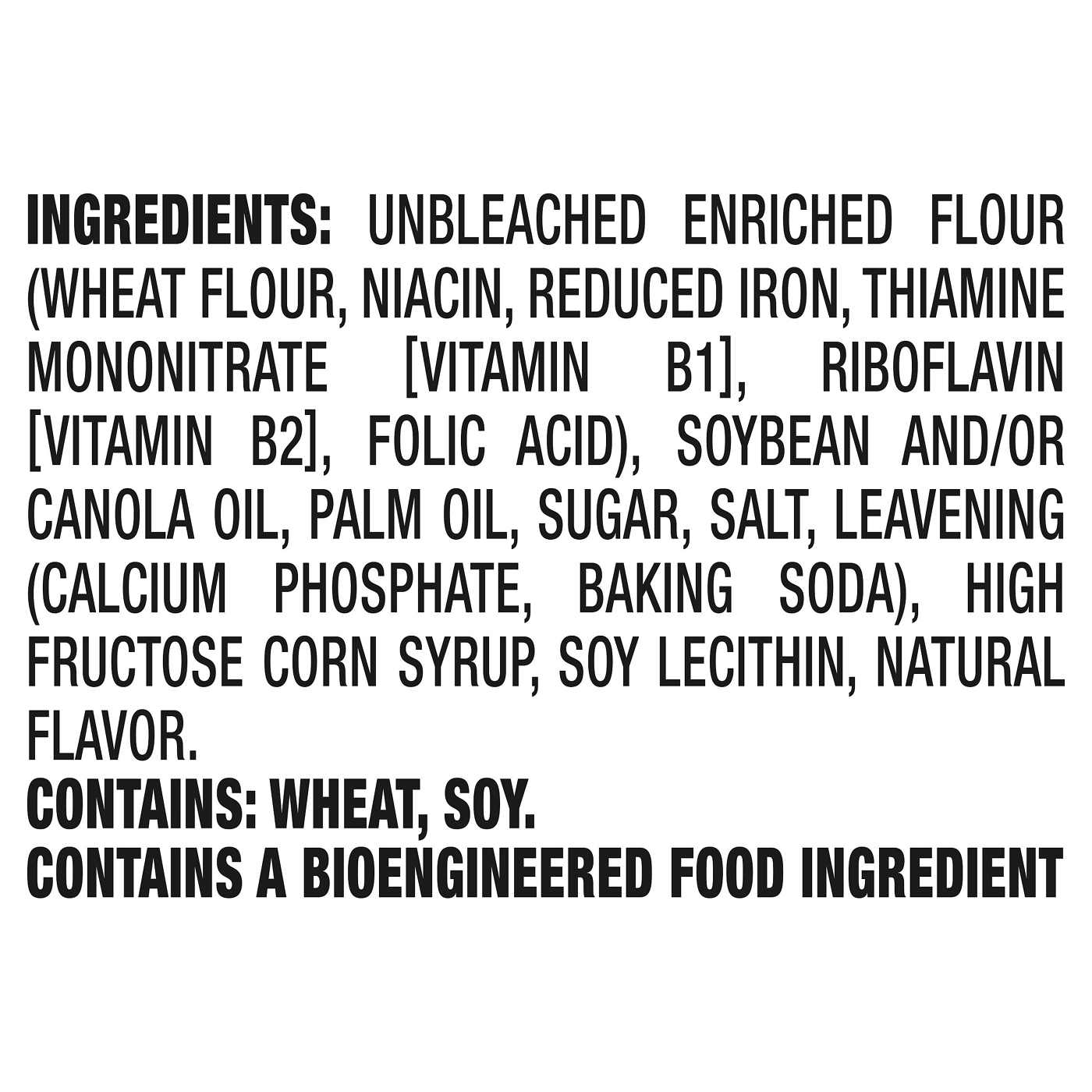 Unbleached Enriched Flour (Wheat Flour, Niacin, Reduced Iron, Thiamine Mononitrate [Vitamin B1], Riboflavin [Vitamin B2], Folic Acid), Soybean And/Or Canola Oil, Palm Oil, Sugar, Salt, Leavening (Calcium Phosphate, Baking Soda), High Fructose Corn Syrup, Soy Lecithin, Natural Flavor.Contains: Wheat, Soy.Allergens and safety warnings