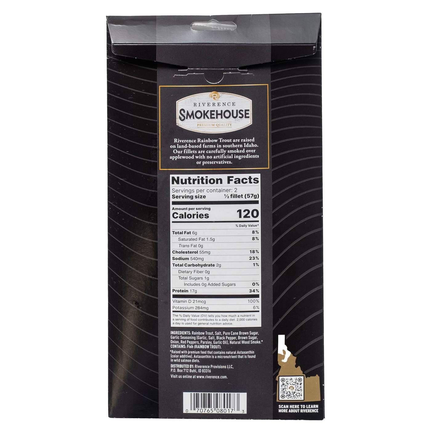 Riverence Rainbow Trout are raised on land-based farms in southern Idaho. Our fillets are carefully smoked over Applewood with no artificial ingredients or preservatives.
