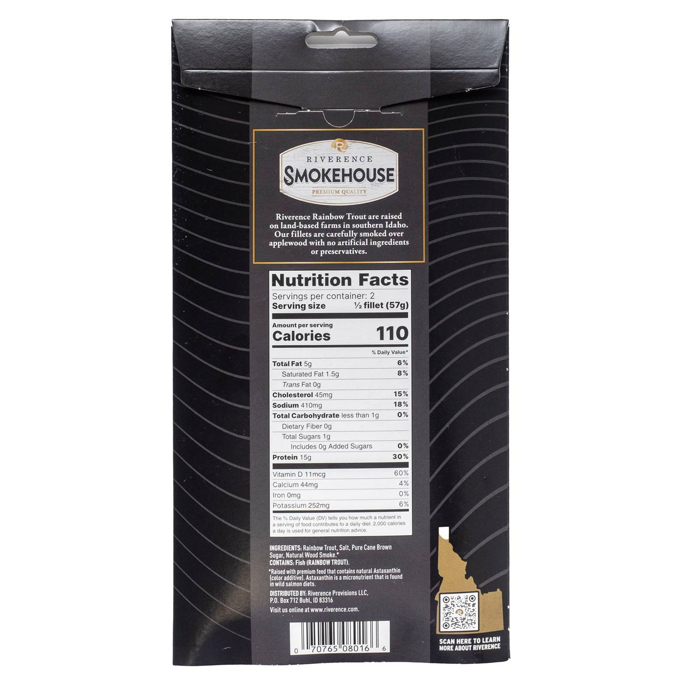 Riverence Rainbow Trout are raised on land-based farms in southern Idaho. Our fillets are carefully smoked over Applewood with no artificial ingredients or preservatives.