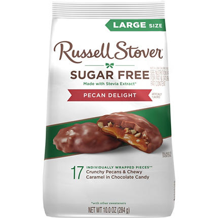 Indulge in the irresistible taste of RUSSELL STOVER Sugar Free Assorted Chocolate Candy. Each 15.7 oz. bag contains about 29 individually wrapped pieces of five assorted sugar free candy favorites: Caramel (chewy caramel covered in chocolate candy), Peanut Butter Cup (creamy peanut butter covered in chocolate candy), Pecan Delight (crunchy pecans & chewy caramel covered in chocolate candy), Coconut (rich and delicious coconut covered in chocolate candy) and Mint Patty (light airy mint covered in decadent dark chocolate). Crafted with Stevia extract, a plant-based sweetener, our sugar free pecan delights offer the perfect balance of sweetness without compromising on flavor. Each piece is individually wrapped for an on-the-go treat, filling up the candy bowl or thoughtful sharing. An American classic since 1923, RUSSELL STOVER has been honoring the craft of chocolate-making using only the finest ingredients and we are proud to offer great tasting, sugar free alternatives to your favorites! Discover the Unbelievable Taste of RUSSELL STOVER Sugar Free Assorted Chocolate Candy today!