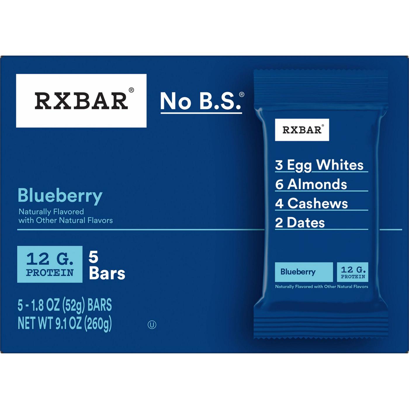 Simple, delicious ingredients make RXBAR protein bars a satisfying way to fuel your day. These wholesome blueberry protein bars are filled with ingredients you can recognize. Each snack bar is made with egg whites for protein, crunchy almonds and cashews, with dates to bind it all together, and no B.S. Enjoy the taste of real ingredients that will crush any sweet cravings you have during the day; Just the right amount to fill you up, each serving contains 12g of protein (21% daily value), is gluten free, and ready to help you take on the day. Enjoy wholesome goodness worth snacking on. On your way to the gym, in the office or paired with your morning cup of joe, improve your daily routine with RXBAR Blueberry protein bars.- Discover a blueberry protein bar made with simple, real food ingredients; Egg whites, almonds, cashews, dates, and no B.S. - Enjoy a snack made with real ingredients; Breakfast bar made with whole ingredients for great flavor and texture; Good source of protein- Gluten free; Contains 12g protein (21% daily value); Kosher Pareve; Contains egg, almond, and cashew ingredients - Protein snacks are great for the office, before or after your workout, or as a quick, feel-good boost for on-the-go snacking - Includes one, 9.1oz box containing five RXBAR Blueberry protein bars- SNAP and EBT eligible item