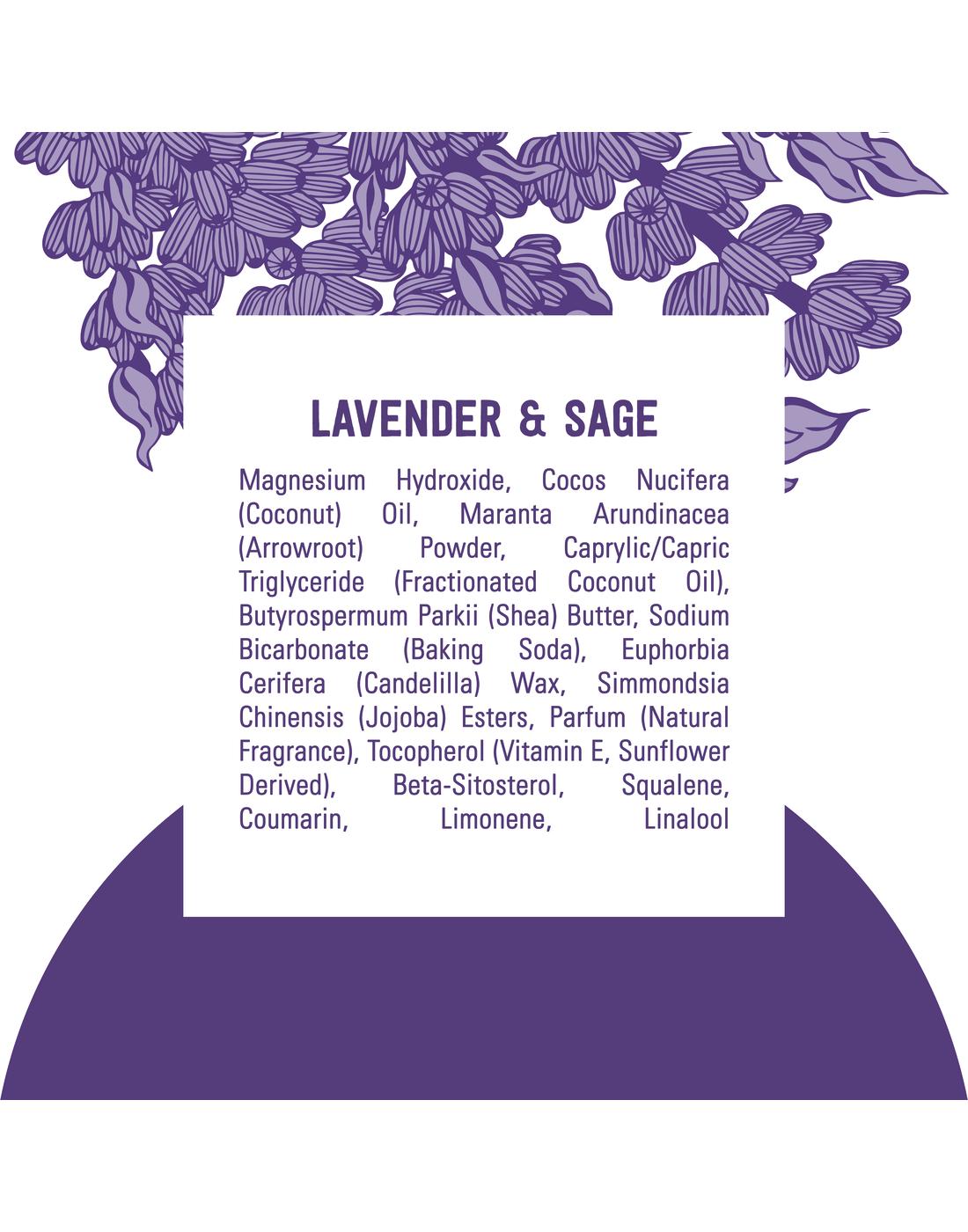 Maranta Arundinacea (Arrowroot) Powder, Sodium Bicarbonate (Baking Soda), Cocos Nucifera (Coconut) Oil, Butyrospermum Parkii (Shea) Butter, Caprylic/Capric Triglyceride (Fractioned Coconut Oil), Euphorbia Cerifera (Candelilla) Wax, Simmondsia Chinensis (Jojoba) Seed Oil, Magnesium Hydroxide, Lavandula Hybrida (Lavender) Oil, Salvia Scarea (Clary Sage) Oil, Tocopherol (Vitamin E, Sunflower Derived).Allergens and safety warnings