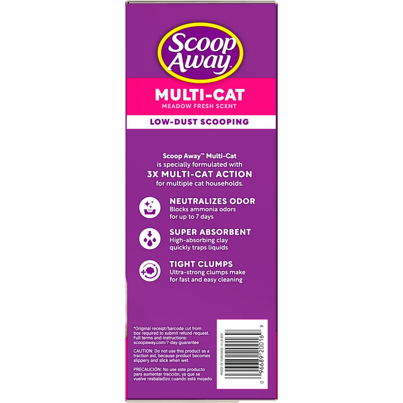 Scoop Away Multi Cat Litter is a clumping litter that delivers maximum-strength clumping and odor control for multiple cats.- 14 LB CLUMPING CAT LITTER: One 14 lb box of Scoop Away Multi Cat Litter delivers ultra strong odor control for multi cat litter boxes; packaging may vary- 3X MULTI CAT ACTION: This clay kitty litter formulated for multi cat households delivers 7 day odor control, is super absorbent and forms tight clumps- 7 DAYS OF ODOR CONTROL: Blocks ammonia odors for up to 7 days, helping to keep your litter box environment smelling fresh and clean in between litter box changes- SUPER ABSORBANT: This clumping cat litter formulated for multi cat households is specially designed with high absorbing clay that quickly traps liquids- TIGHT CLUMP STRENGTH: Clumping cat litter forms ultra strong clumps to make scooping the cat litter box fast and easy and helps prevent stinky crumbles from being left behind